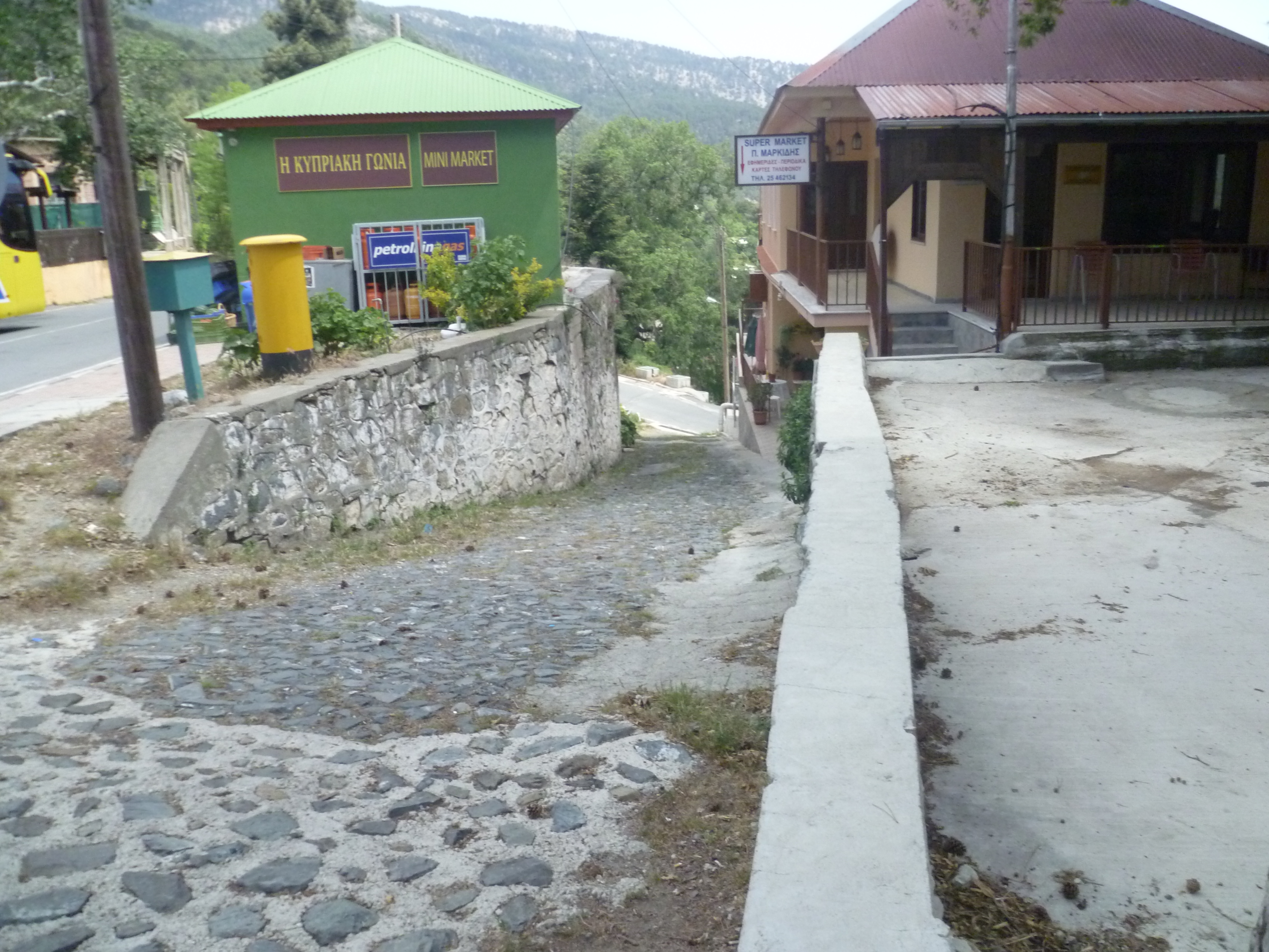 Cross the bridge and continue along the path which will pass some buildings on your right and a children’s playground on your left before leading you to an information board next to the main road (F828). Turn left onto the road and follow it uphill to arrive at the roundabout in Prodromos (2 hours 55 minutes).