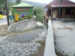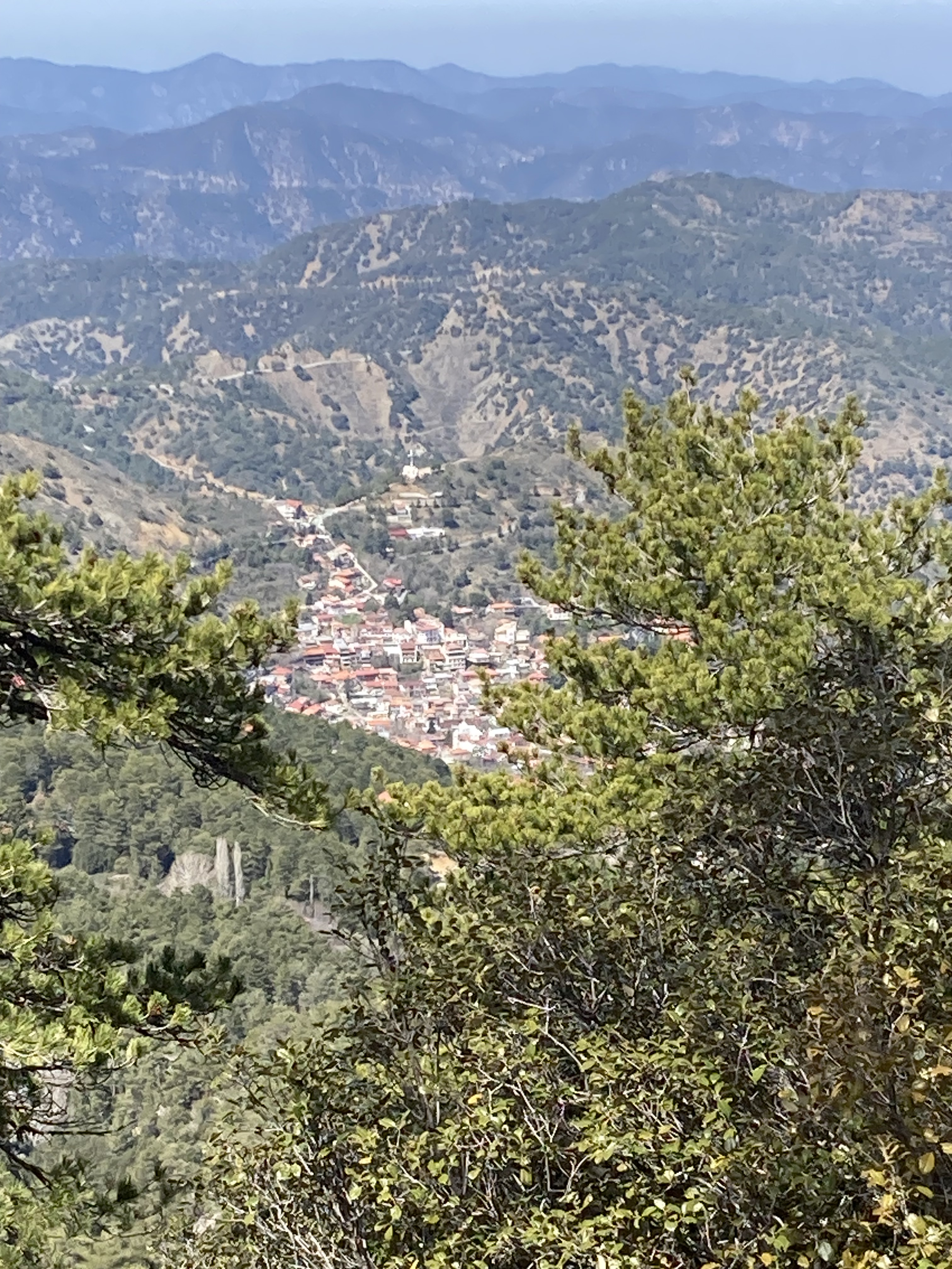 Follow the stony path along the hillside soon reaching a railing along the left hand side with lovely views towards the village of Pedoulas. Apparently the large cross and small white building that you can see is a Balkan War memorial, although we haven’t yet checked this out.