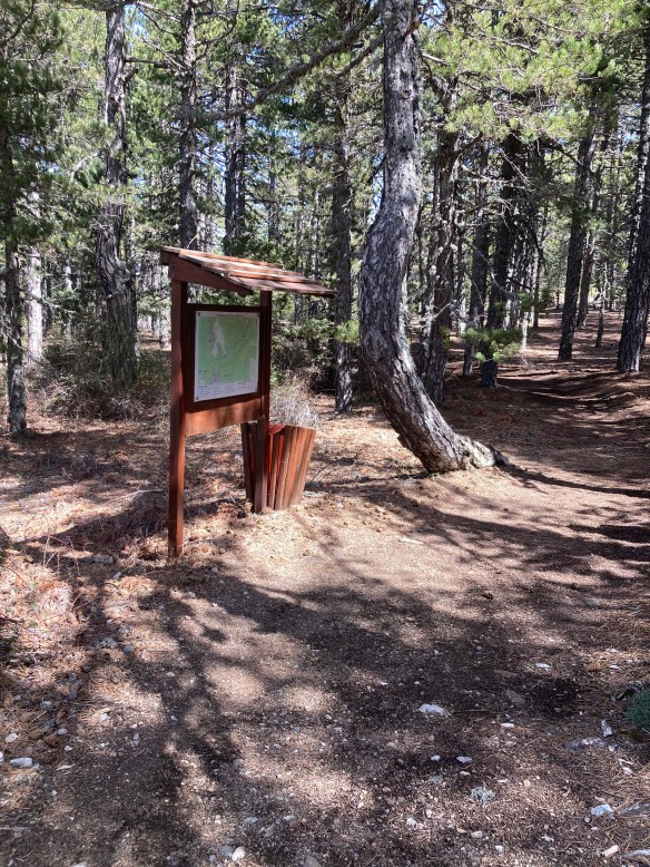 After 10-12 minutes arrive at an information board. Take a hard left (almost a U-turn) here to follow the path as through the pines.