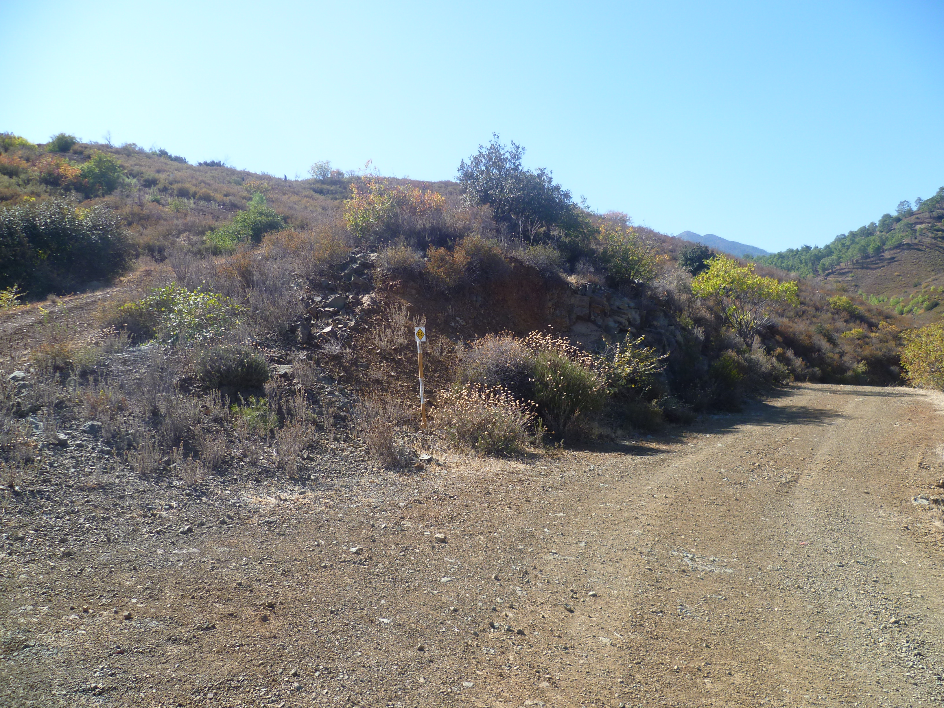 Keep following the main path downhill and at 4 hours 45 minutes you will pass a helicopter pad on your left just as you reach a junction where a (now-rusted) green signpost indicates ‘Lythrodontas 9.5km Vavatsinia 8.5km’.