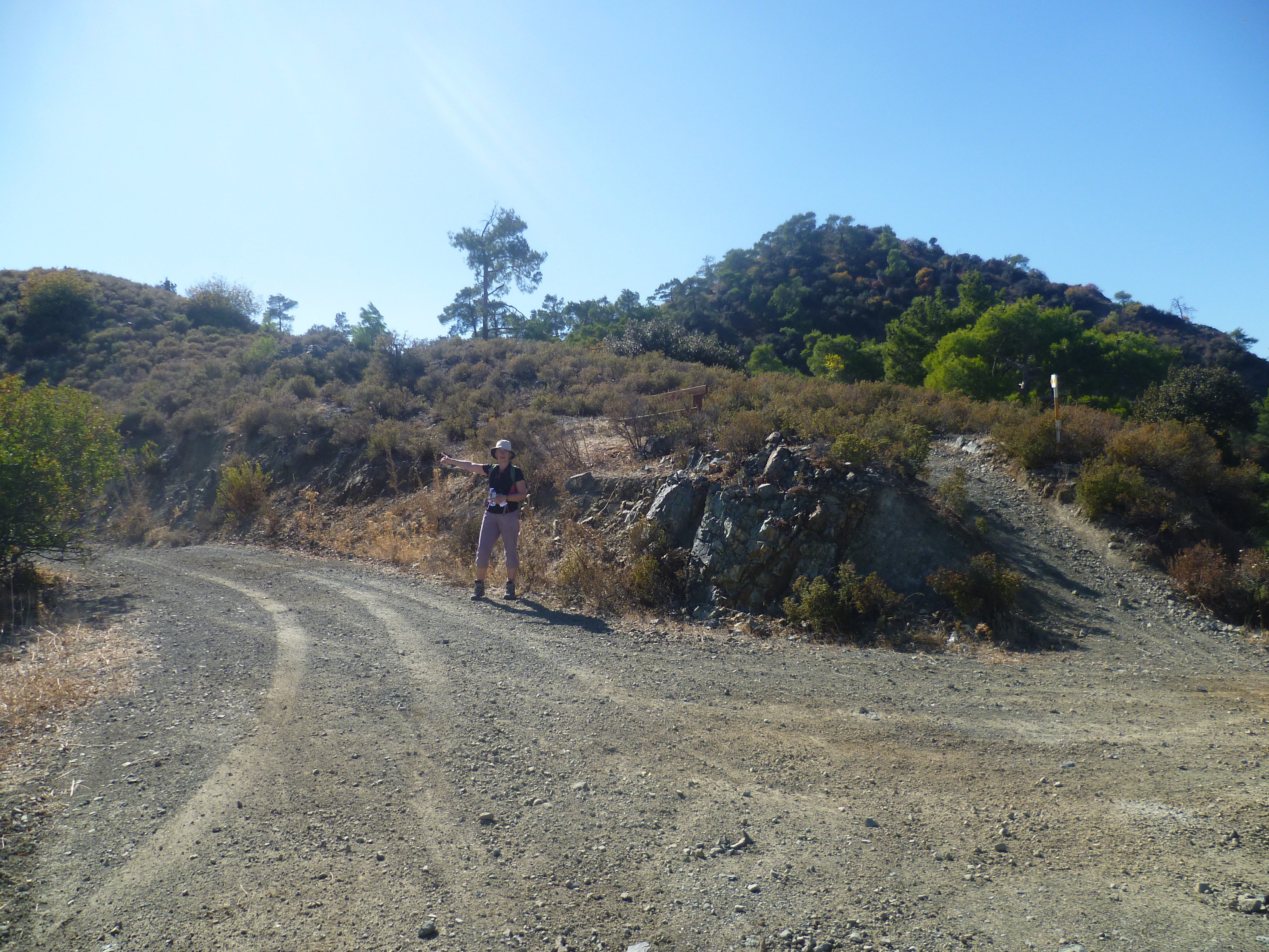 After about 4 hours 5 minutes (timings from now on ignore the lunch stop) you arrive at a junction. There is a signboard to ‘Throni 750m’ pointing right and the E4 is signed to the left up the hill ahead. Follow the E4 for about 100 more metres and you will arrive at the junction pictured below. You are going to leave the E4 here and you should head along the earth track to the left, passing a wooden bench to your right. Jane is pointing the way in this photo.