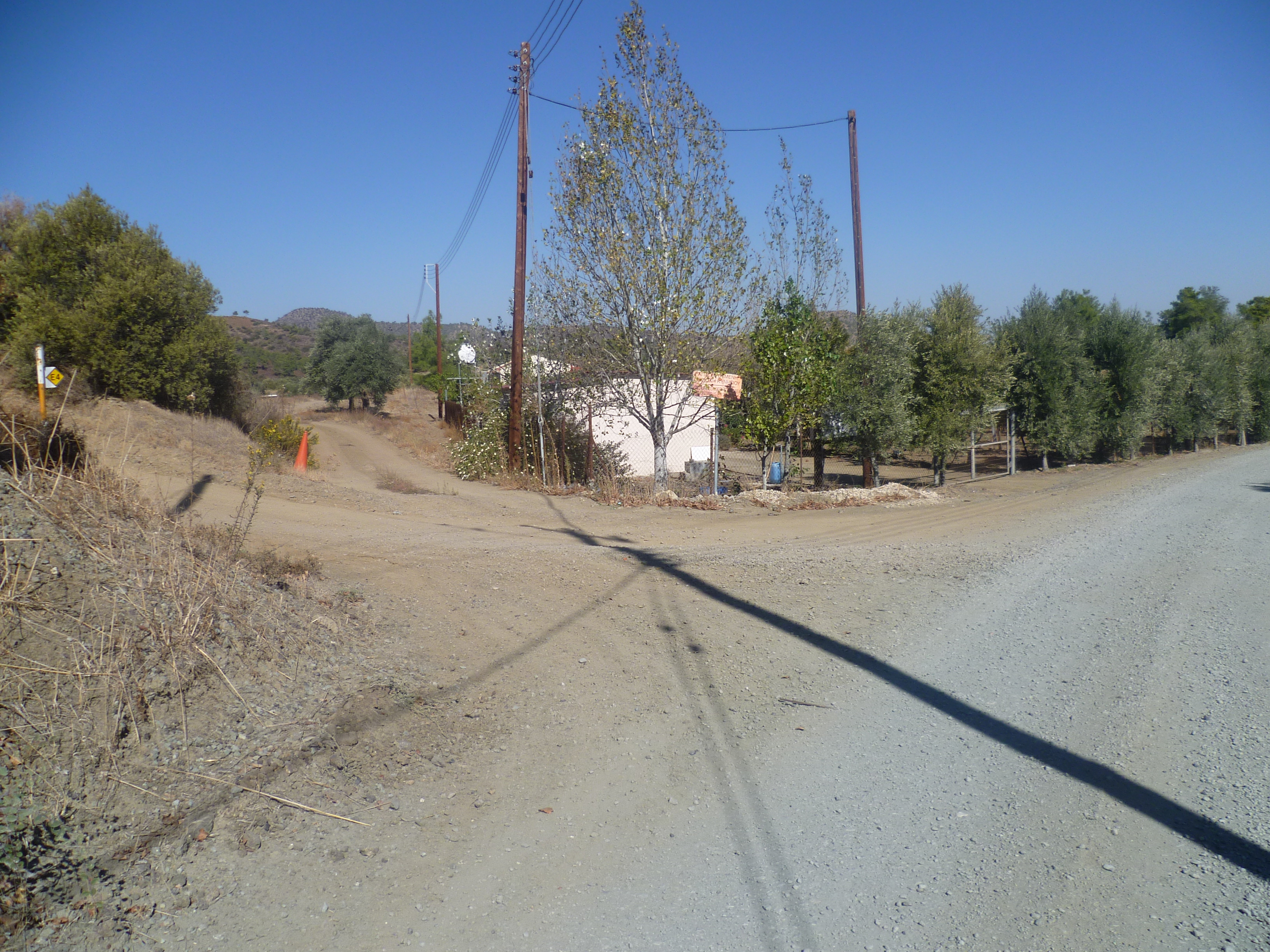 Stay on the track uphill, passing through olive groves, and at 2 hours 10 minutes you will arrive at a junction. Just ahead of you is a small farm with orchards surrounded by a chain link fence. There is a telegraph pole to your left and near this there is a sign marking the E4 footpath. You are joining the E4 at this point, so turn left uphill here…