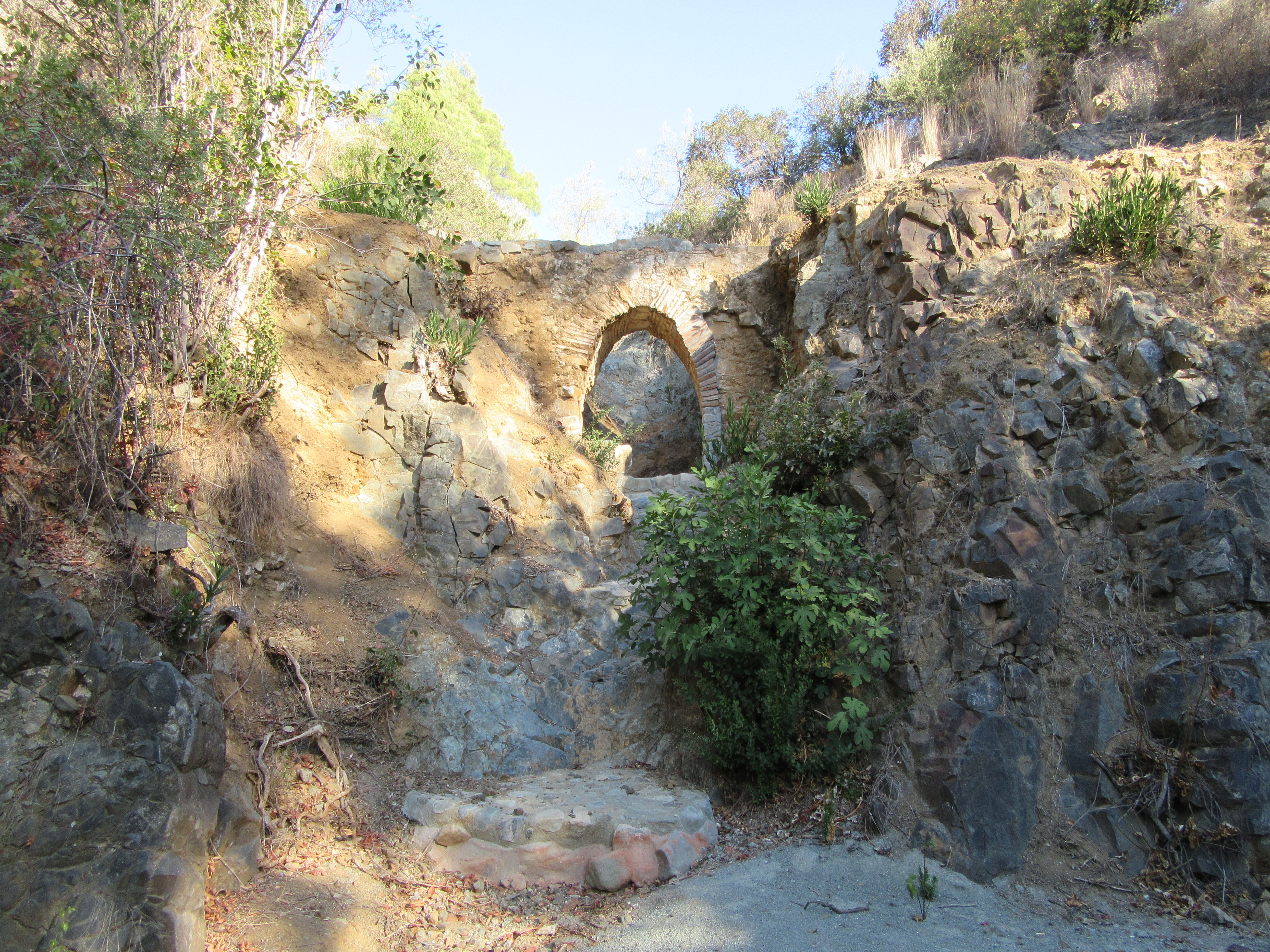 At 1 hour 15 minutes you will cross a stream bed – you may need to wade through some deliciously cool waters in the spring months! – and, almost immediately afterwards, see a beautiful stone archway set back in the trees to your left…