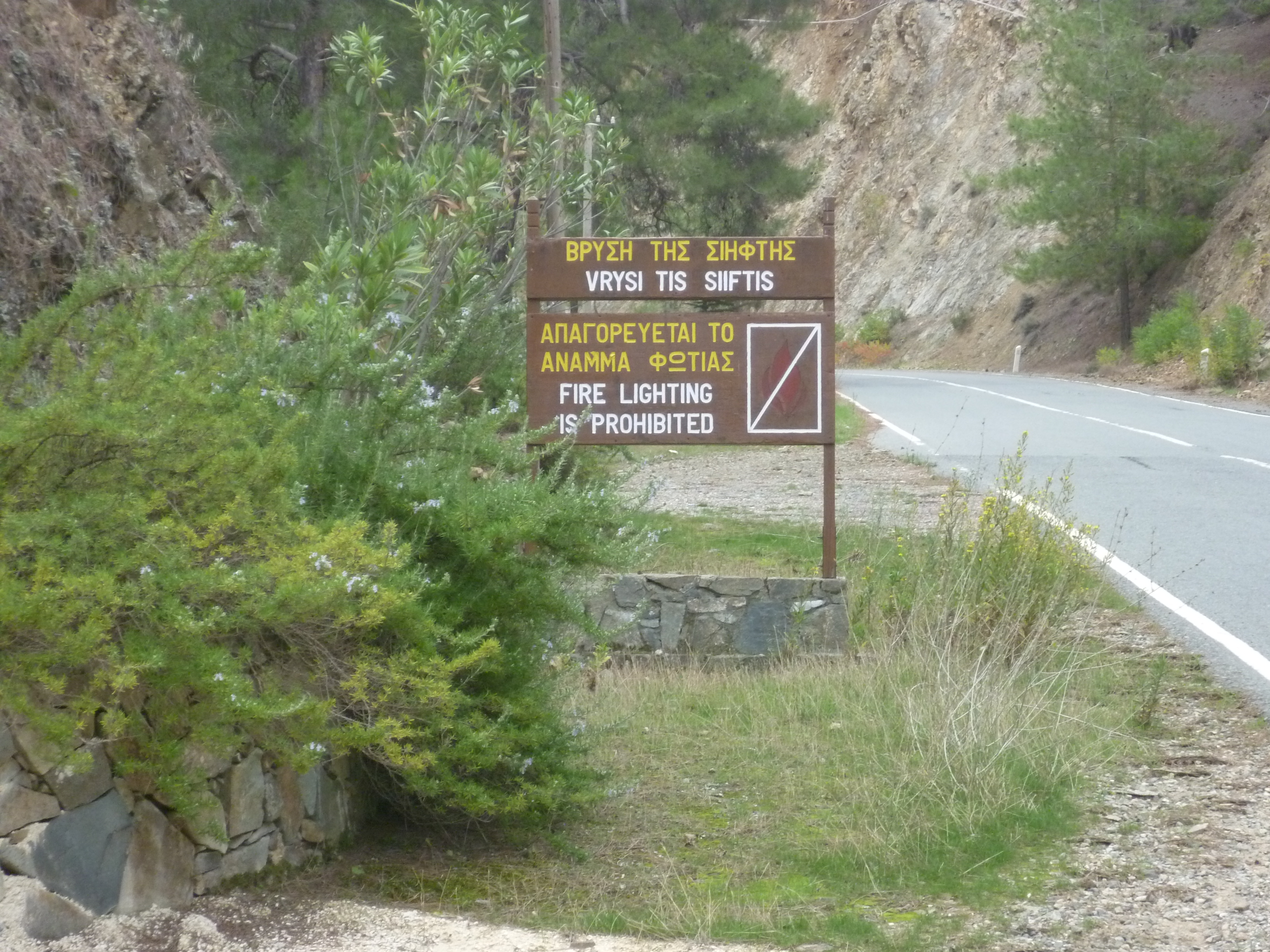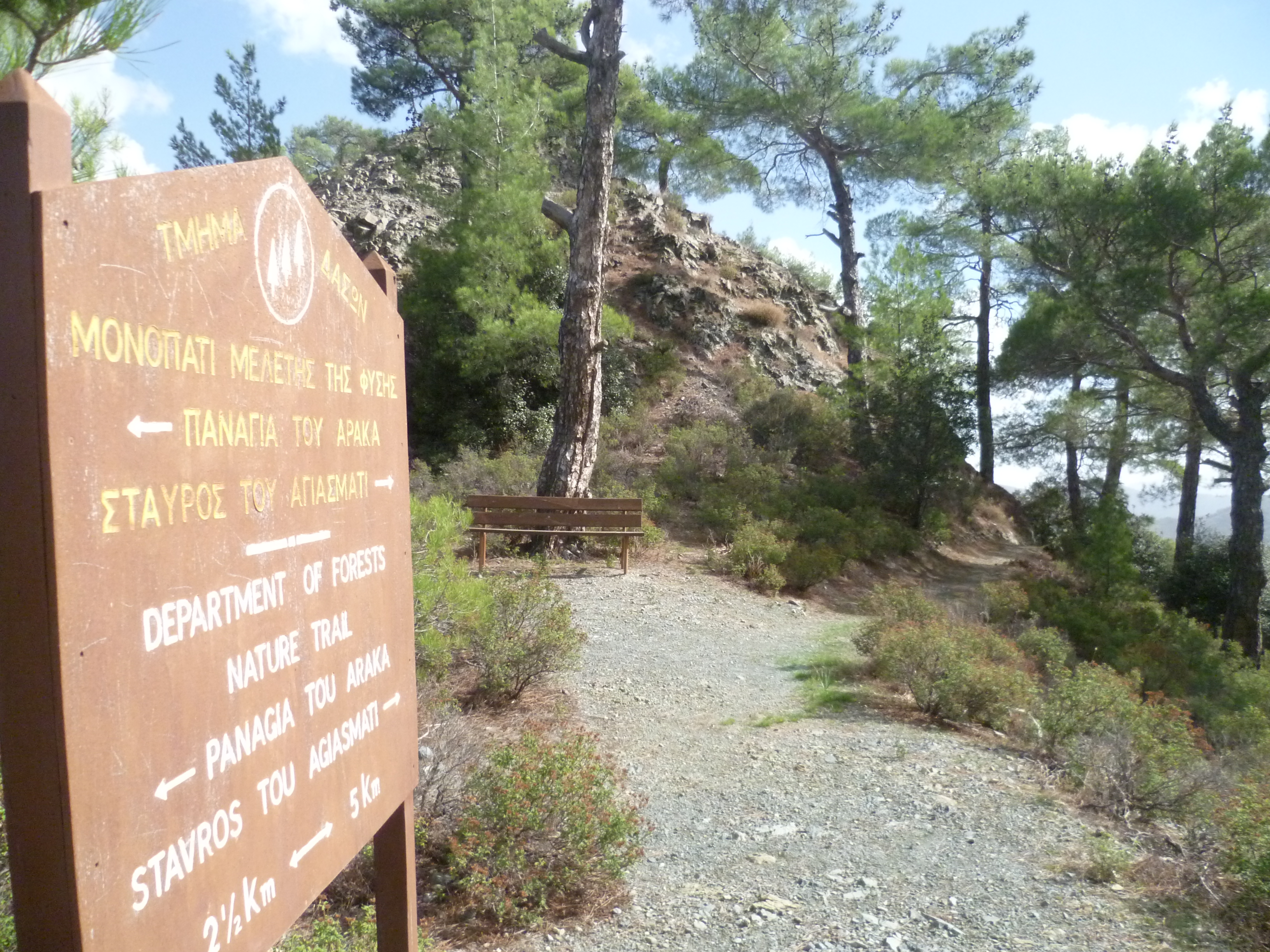 The path continues to climb steadily, leaving behind the terraced vineyards and winding uphill through pine forest interspersed with the sheet dyke rock formations that characterise this part of Cyprus. There’s plenty of shade, some good views to your left and nothing too strenuous by the time you arrive at the first main marker board and resting place at 2 km in around 45 minutes.