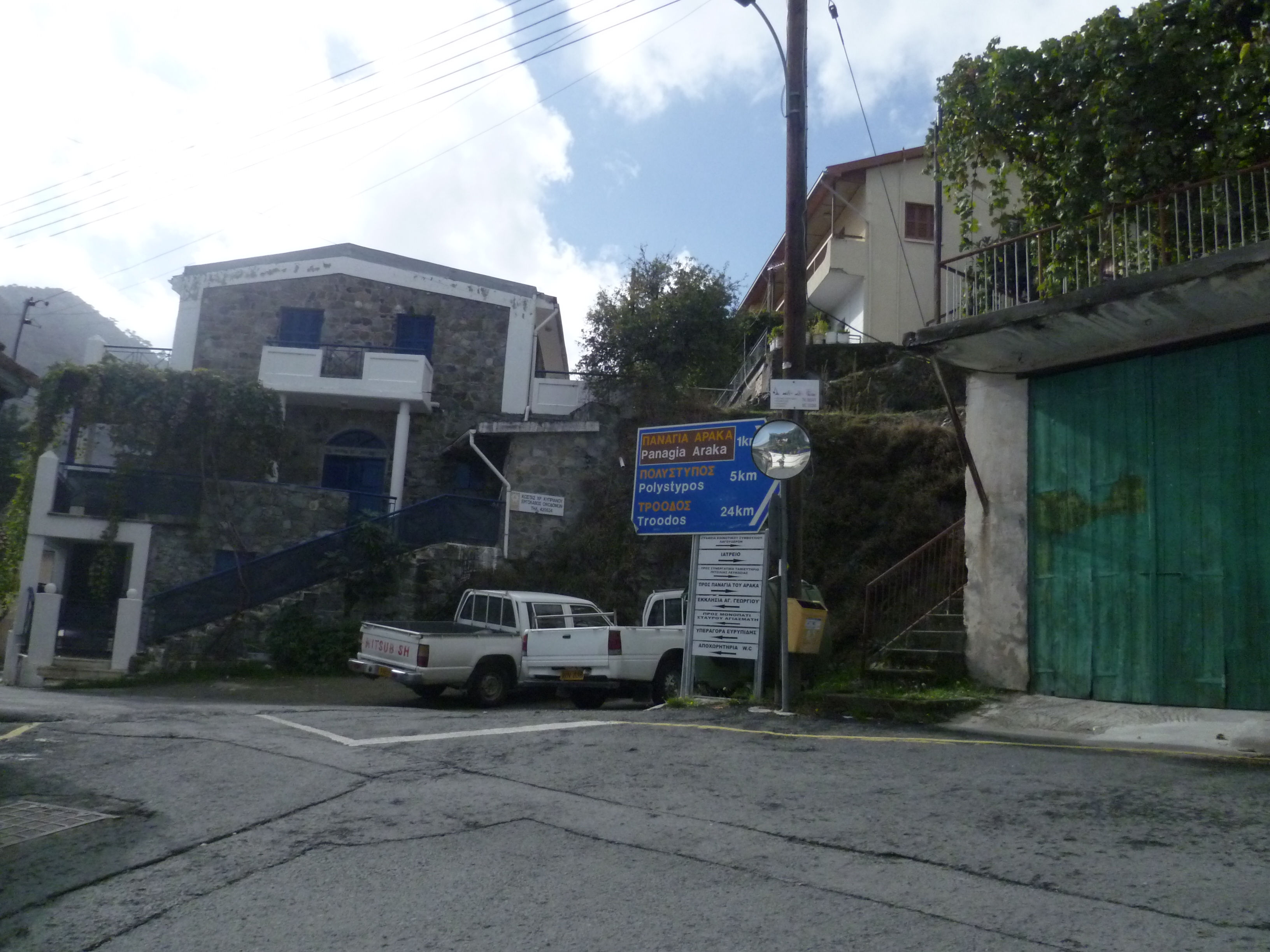 When you reach the first junction (3-4 minutes) turn left and head down to the centre of Lagoudera. After 10 minutes you will reach a junction in the village centre where a signpost points back towards the church, also to Polystopos 5km and Troodos 24 km.