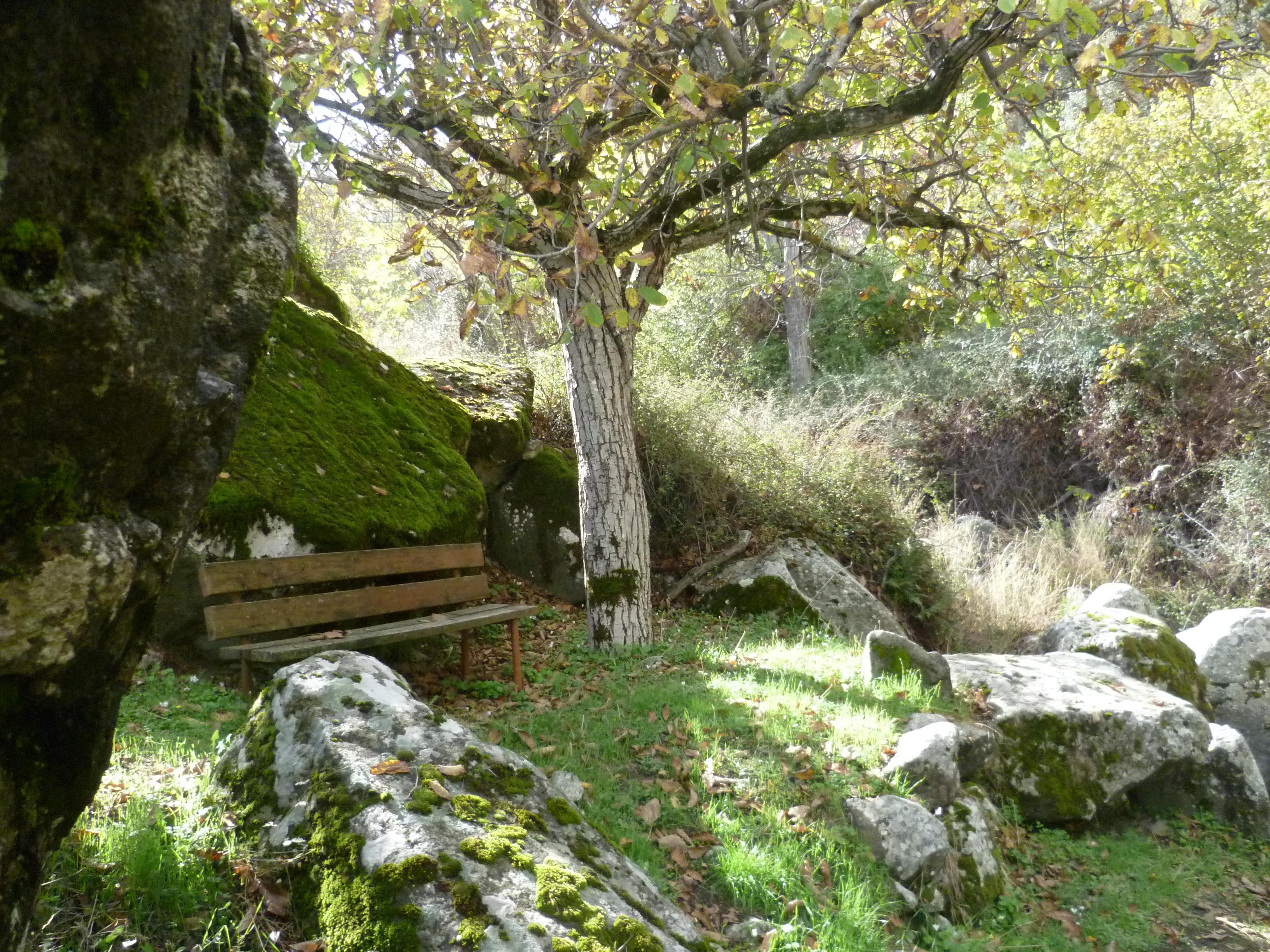 After 15 minutes you will see a wooden signpost pointing to the nature trail. This will take you off the road and onto a path which heads briefly downhill, then starts to climb along the other side of the valley. At 17 minutes you will cross a wooden bridge to reach a bench in a delightful shady spot.