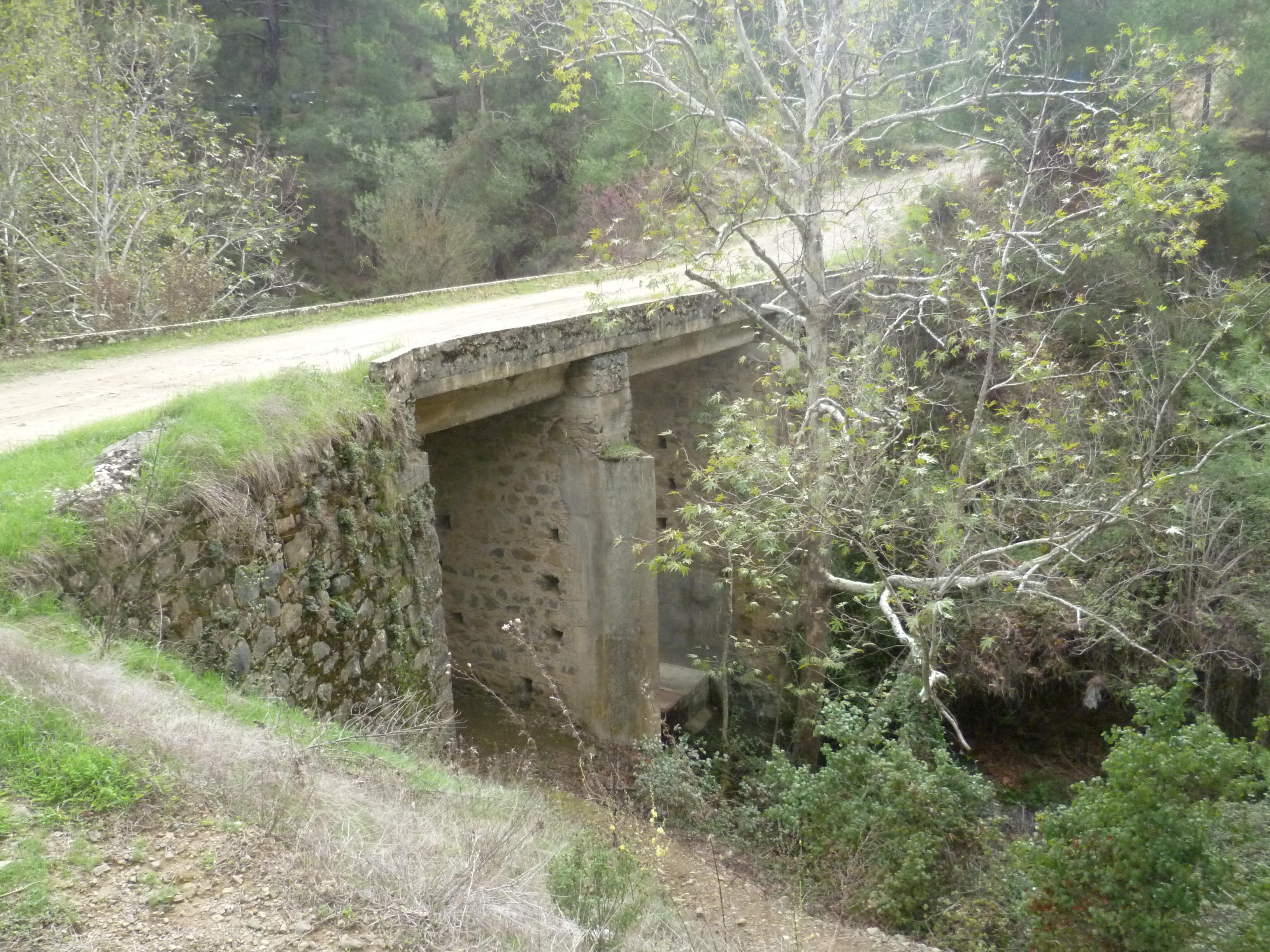 This is a tranquil walk along a little-used earth track in open forest and with good views across and down into the valley. Occasional signboards point backwards to Stavros tou Agiasmati, increasingly giving the lie to the short straight distance (erroneously) indicated on the CTO map. As the track langourously winds its way down into the valley bed, this turns into a six-kilometre stretch and the bridge is not reached until approximately 3 hours 30 minutes.