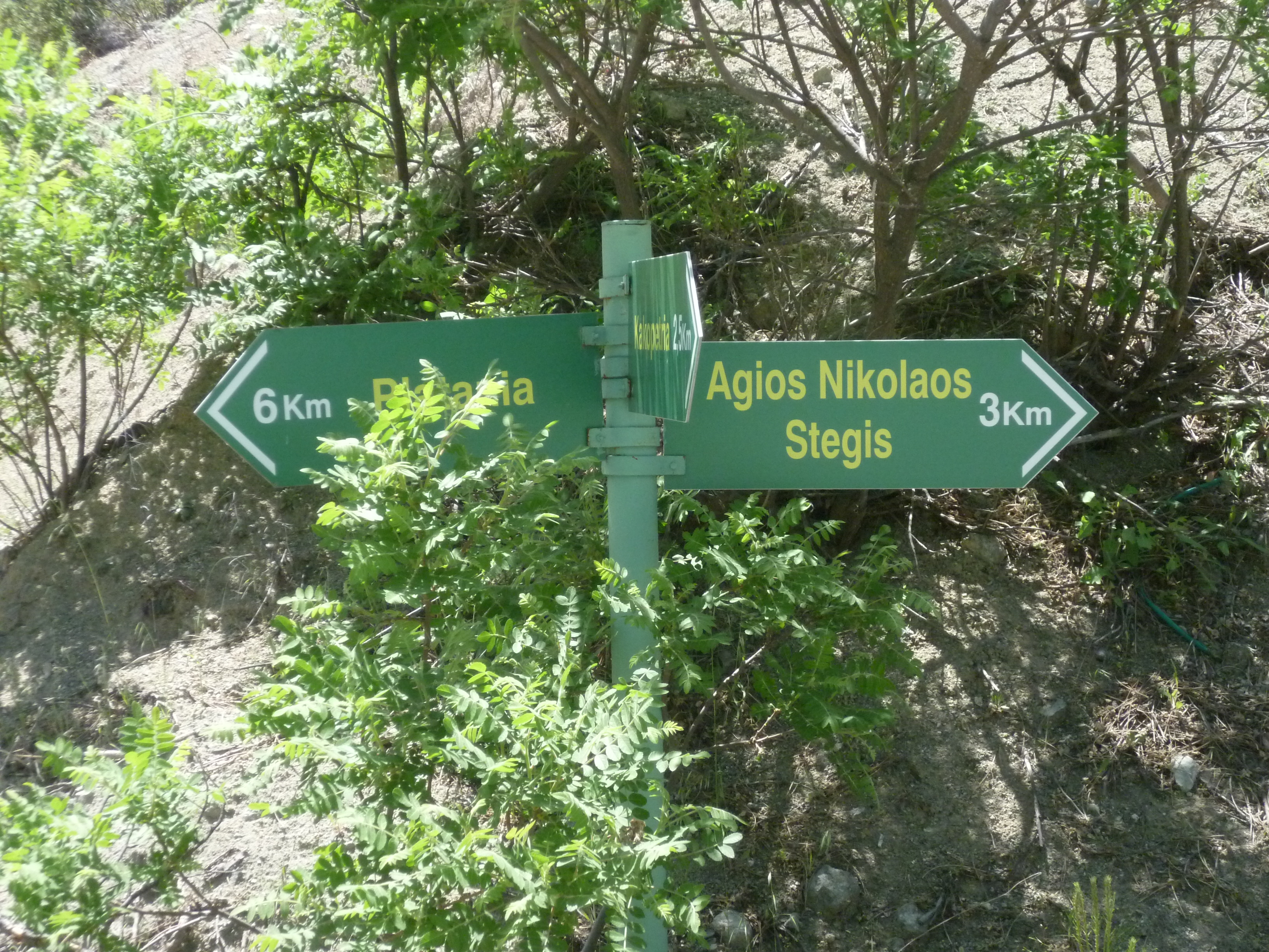 Continue onward in the direction of ‘Agios Nikolaos Stegis 3km’ following the track as it winds downhill. After 3 hours 30 minutes you will get your first glimpse of the church of Agios Nikolaos tis Stegis below to your right…