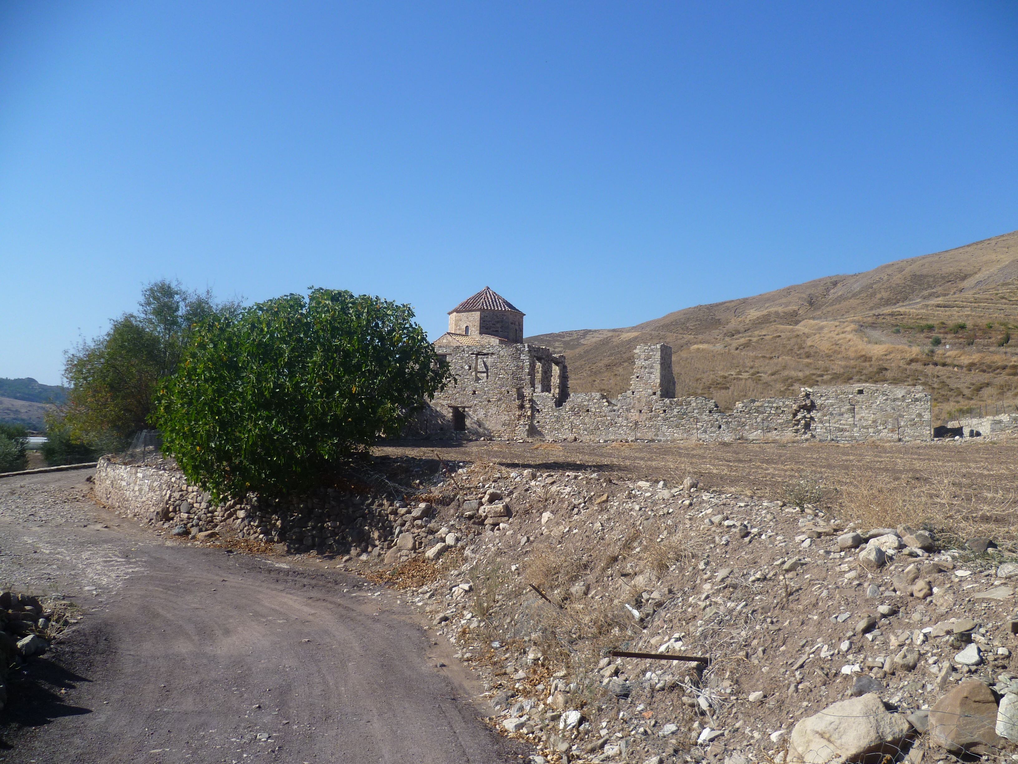 Don’t cross the river. Turn left and make your way along one of the numerous tracks which follow the river (or more likely the dry river bed) upstream. In a few minutes you will see the restored but deserted monastery church of Panagia tou Sinti ahead of you.