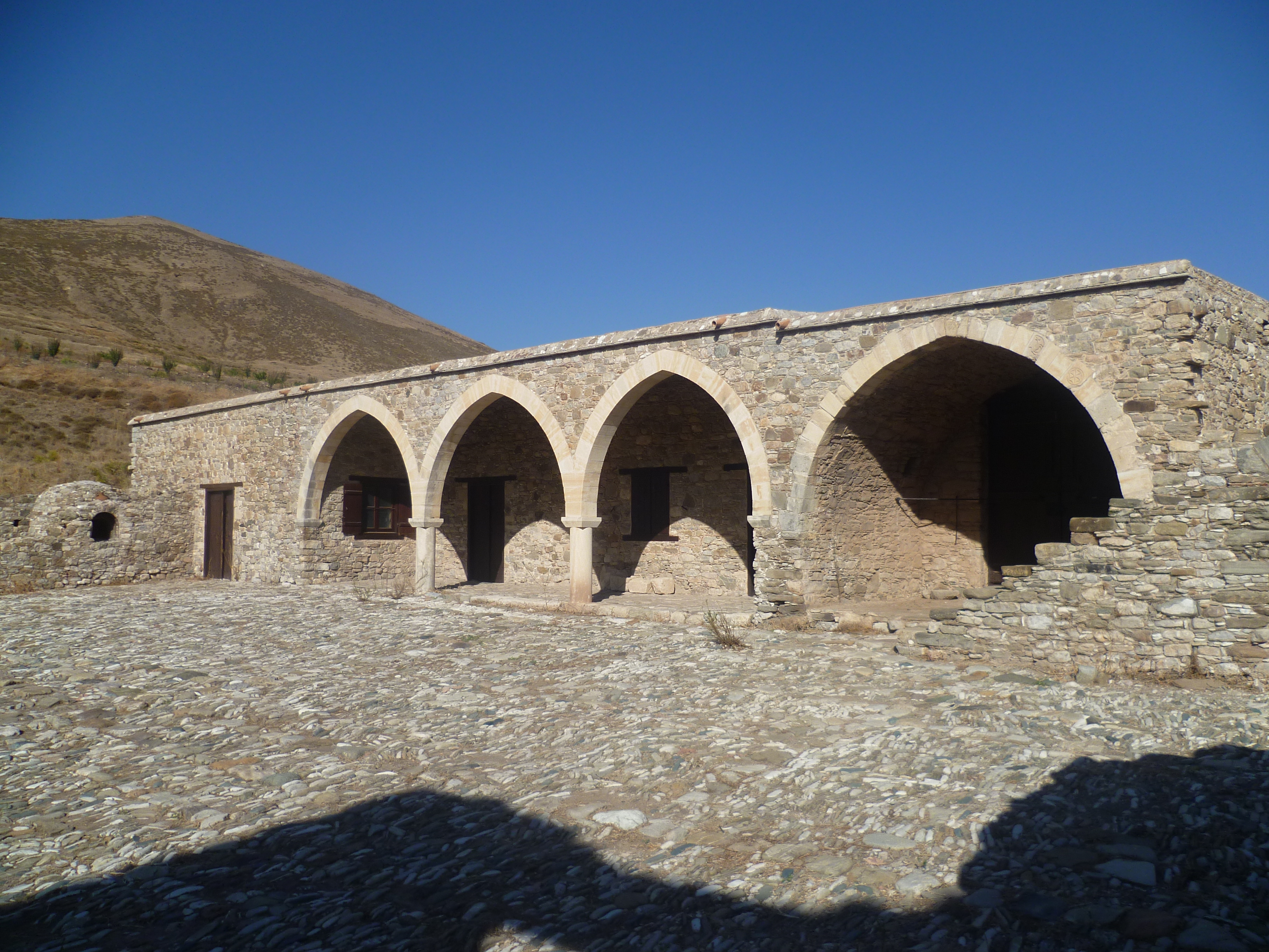 We think that Panagia tou Sinti is one of the loveliest places in Cyprus and you will almost certainly have it to yourself. It was sympathetically restored in the 1990s. The 15th century church (sometimes locked) is on the south side of a courtyard which has a well in the centre and is surrounded on the other three sides by partially restored outbuildings. You can sit in the shade of the cloisters to rest and listen to the hundreds of house sparrows nesting in the ruins. Water is available just outside the monastery gates and there is even a toilet block away behind the site!