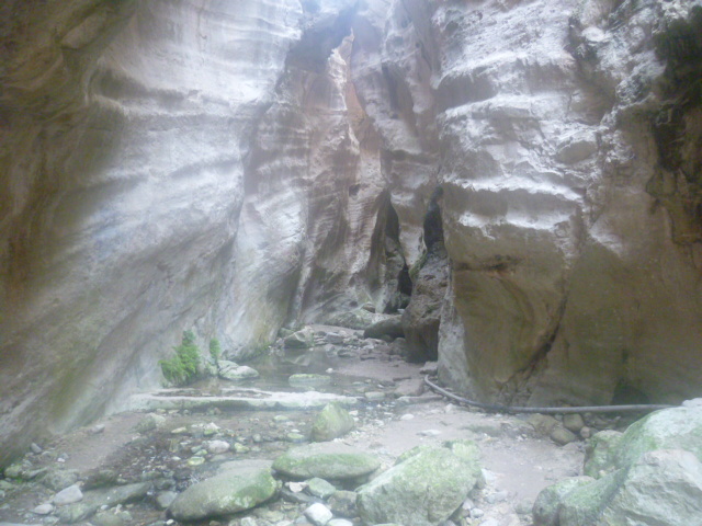 The walk through the gorge should take just under two hours – from the point at which you climb the stone steps at the start to arriving at the top of the hill at the head of the gorge. It’s difficult to be precise on this as much will depend on your skills in orienting yourself around mud, across water, over boulders and through bushes. You may also get briefly led astray by promising-looking goat paths which flatter to deceive! The basic path lies only in the bed of the ravine – sometimes on the left of the water and other times on the right.