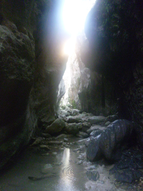 Straight away you are entering into the base of a deep ravine where pools have formed and water flows. You’ll need to clamber across boulders and stone-hop across streams. The stone walls of the gorge close in until they are barely a few metres apart and the only available light streams downwards from the sunlit sky above.