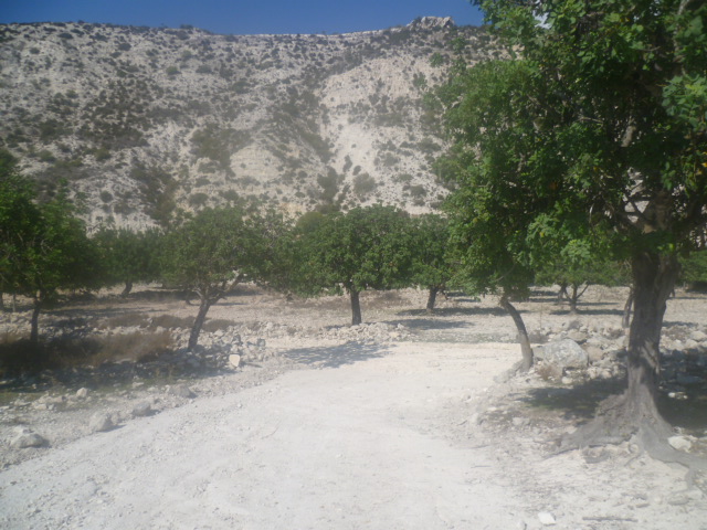Turn right and walk steadily uphill, passing more old stone animal sheds and walking through a carob orchard until you reach a T-junction at 2 hours 55 minutes.