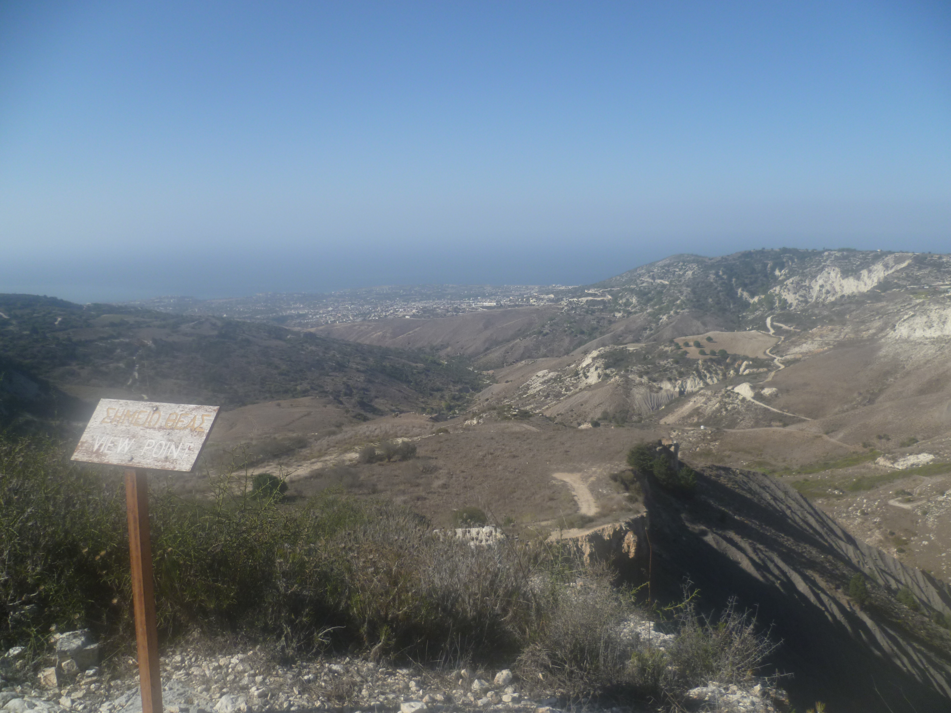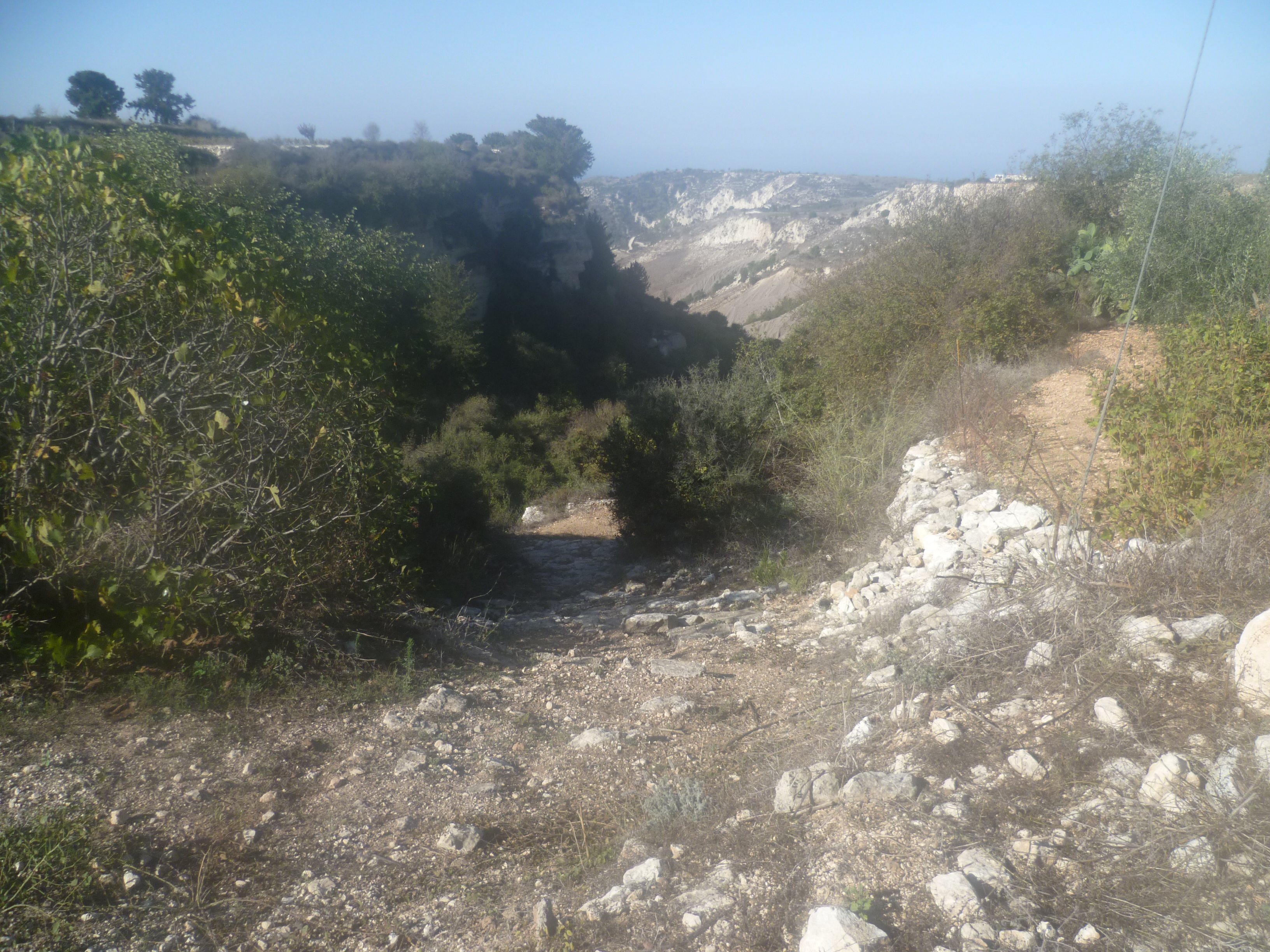 4. My wife and I have just returned from doing this walk ( Walk 12 in the Sunflower book)..We found the rocky path descent to the trail in spite of the absence of any trail sign. However, the descent into the valley was overgrown and the subsequent path up the cliff face looked muddy so we cut our losses and walked on almost to the Ag Marina church where there is a right turn and a trail arrow..We followed this reverse direction of the walk as far as the seat at the top of the cliff.. This is the 45 minute point in the walk. Having looked over the edge of the cliff at the zigzag path down we retraced our steps to Ag Marina and followed the directions from there. As others have pointed out, the sharp left hand track edging a vineyard is hard to identify (point 7).. We thought we had found it but the track we were following took us into the rows of vines. We turned back and continued along the main track for some time until we encountered a concrete track to the left alongside another vineyard..We followed this diligently, taking the right hand path at an obvious junction. The concrete reverted to trails and back to concrete until eventually we took a sweeping left turn up to the Akoursos road that we could see above us. A right turn brought us back to the car park in Kathikas in about 10 minutes. We suspect because of timings this junction was not far from the junction in the book but from a further circuit and may be the same one. The description at point 7 in the Sunflower book certainly needs further clarification.