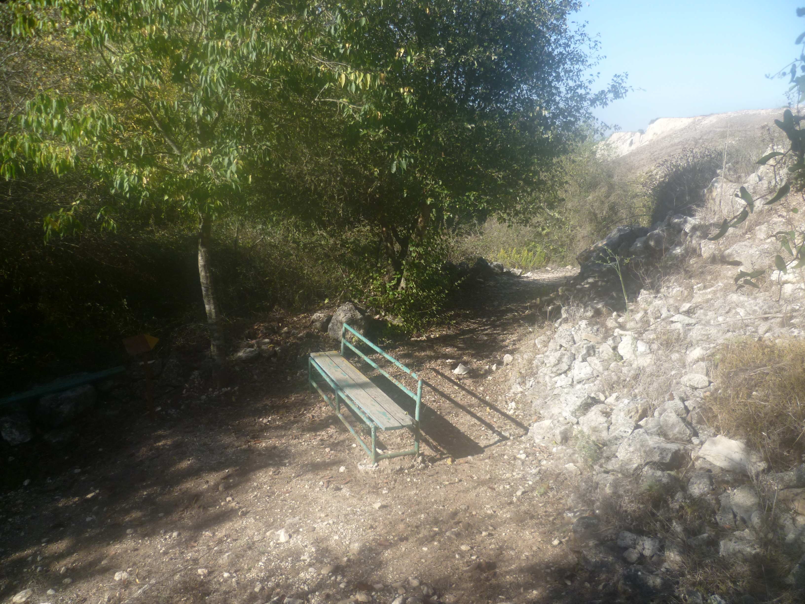Walk down the rocky path as it descends to the valley bottom. A tree has fallen across the pathway, but it’s easy to duck underneath and continue downhill to reach a spring and some benches (20 minutes).