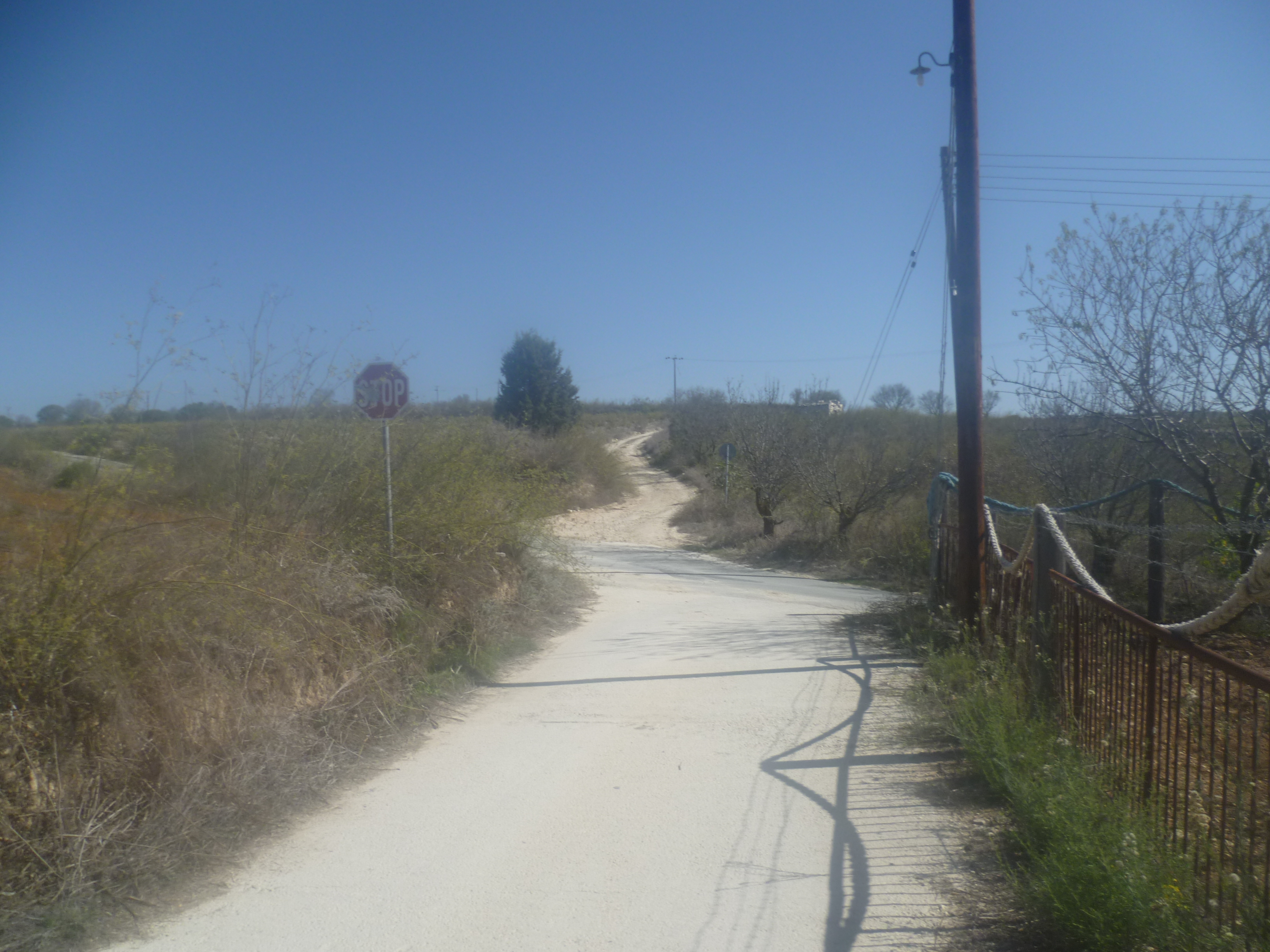 Continue up along the dirt track for a further few metres until it reaches a concrete road. Turn left here and head past a building with a chain-link fence on your right then alongside vineyards until you arrive at a crossroads (55 minutes).