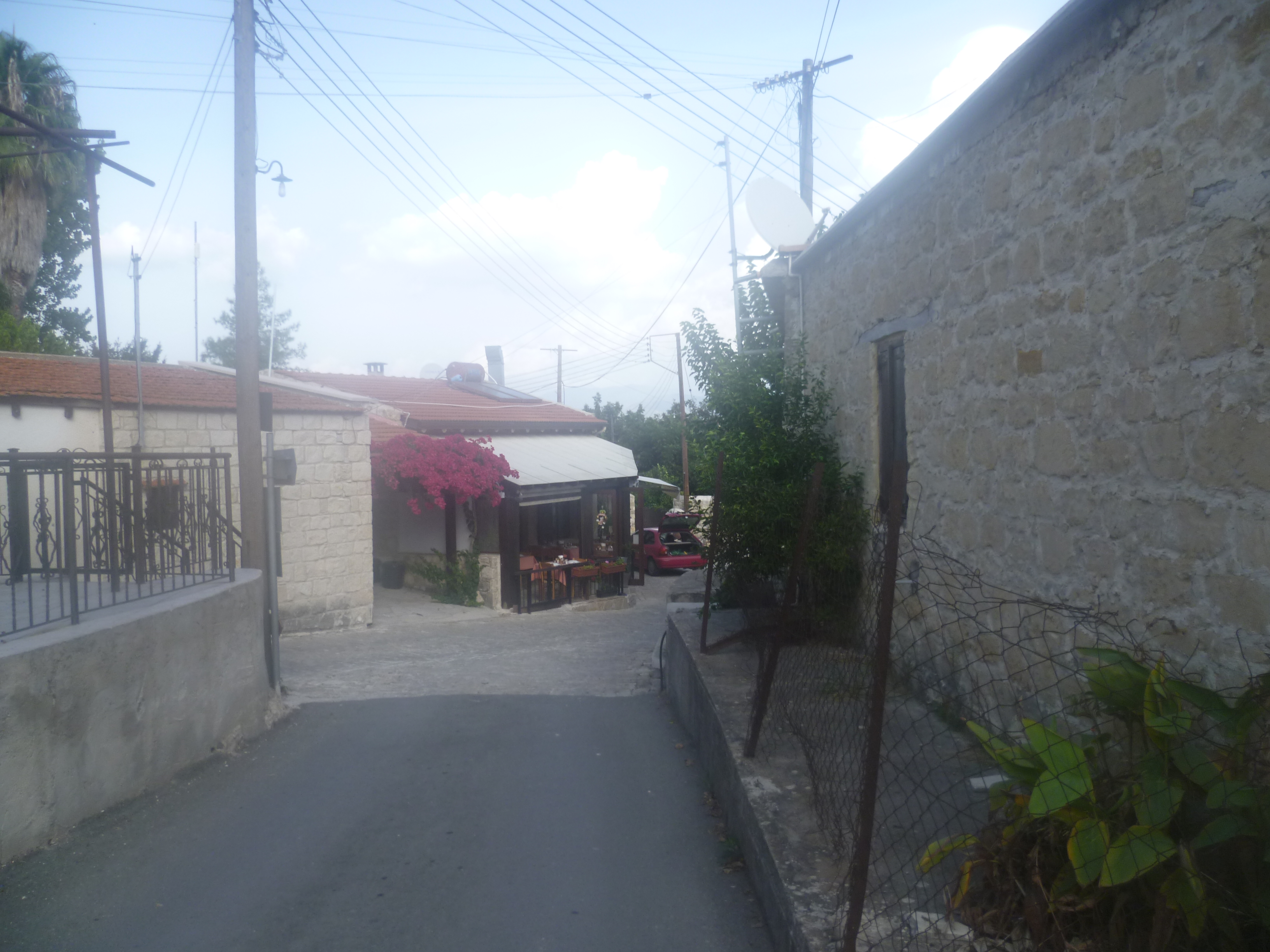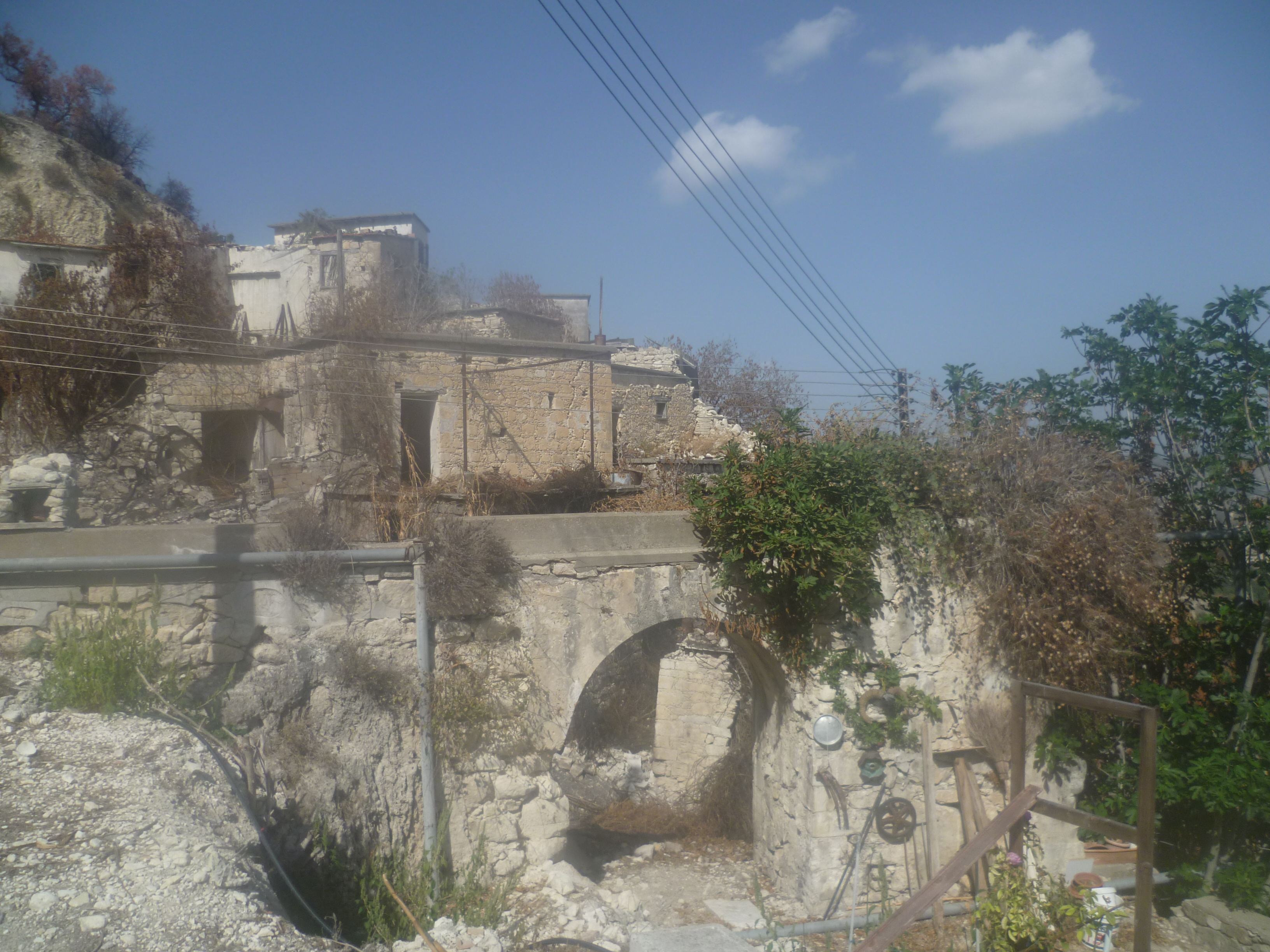 Continue to climb up this track until, at 1 hour 19 minutes, the gradient starts to level out and you arrive at the largely deserted village of Kato Theletra, allegedly abandoned as a result of landslip fears. Your route will head away from the village uphill along the asphalt road to your right, but take a little time to explore this fascinating spot.