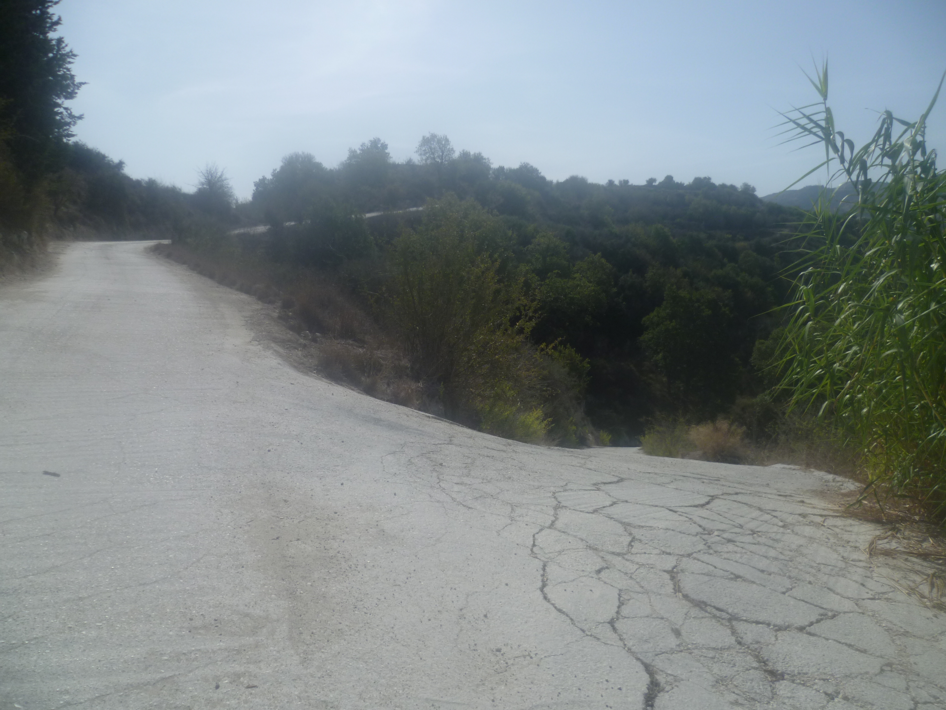 The road winds around to the right here and you should keep following it as it descends gradually round the gorge, ignoring tracks off to the left and right. A group of concrete water tanks on your left (2 hours 41 minutes) will confirm your path, and about 10 minutes later you will arrive at the asphalt road coming from Kathikas on the left.