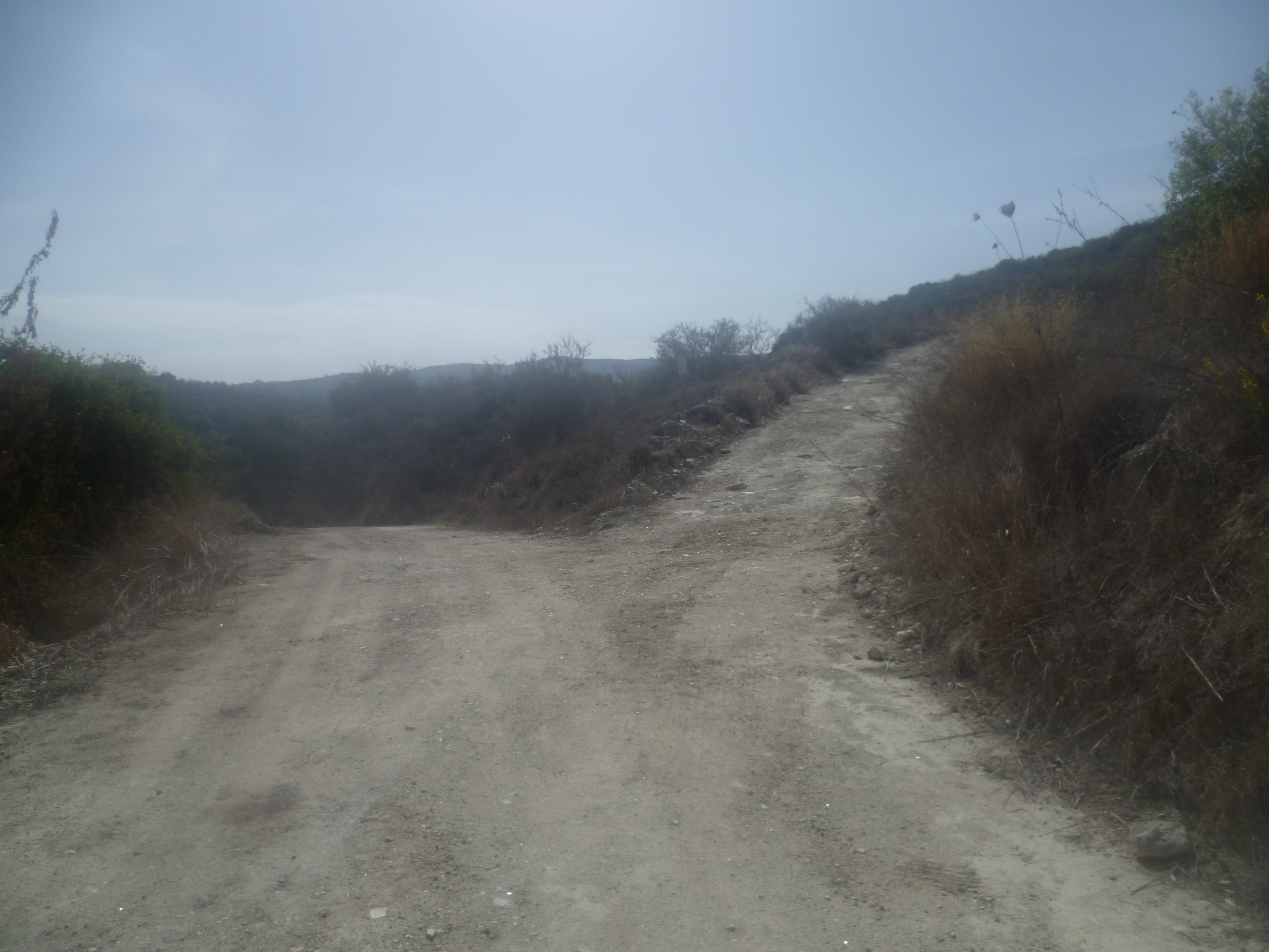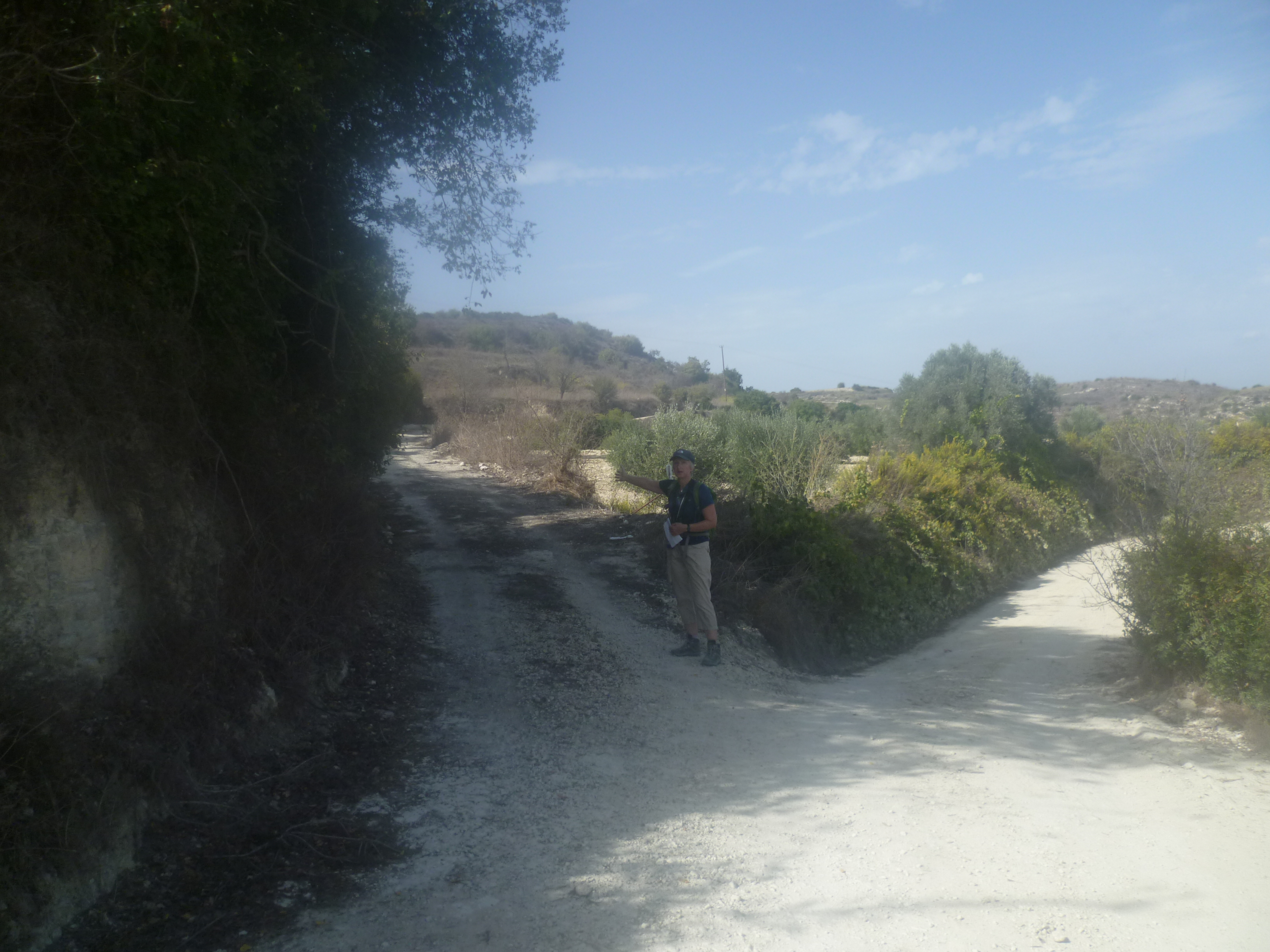 Follow this uphill as it veers slightly to the right and arrives at a small junction with a track to the right. Continue straight ahead, walking now with views across almond trees and more distant fruit groves to the hills on your left.
