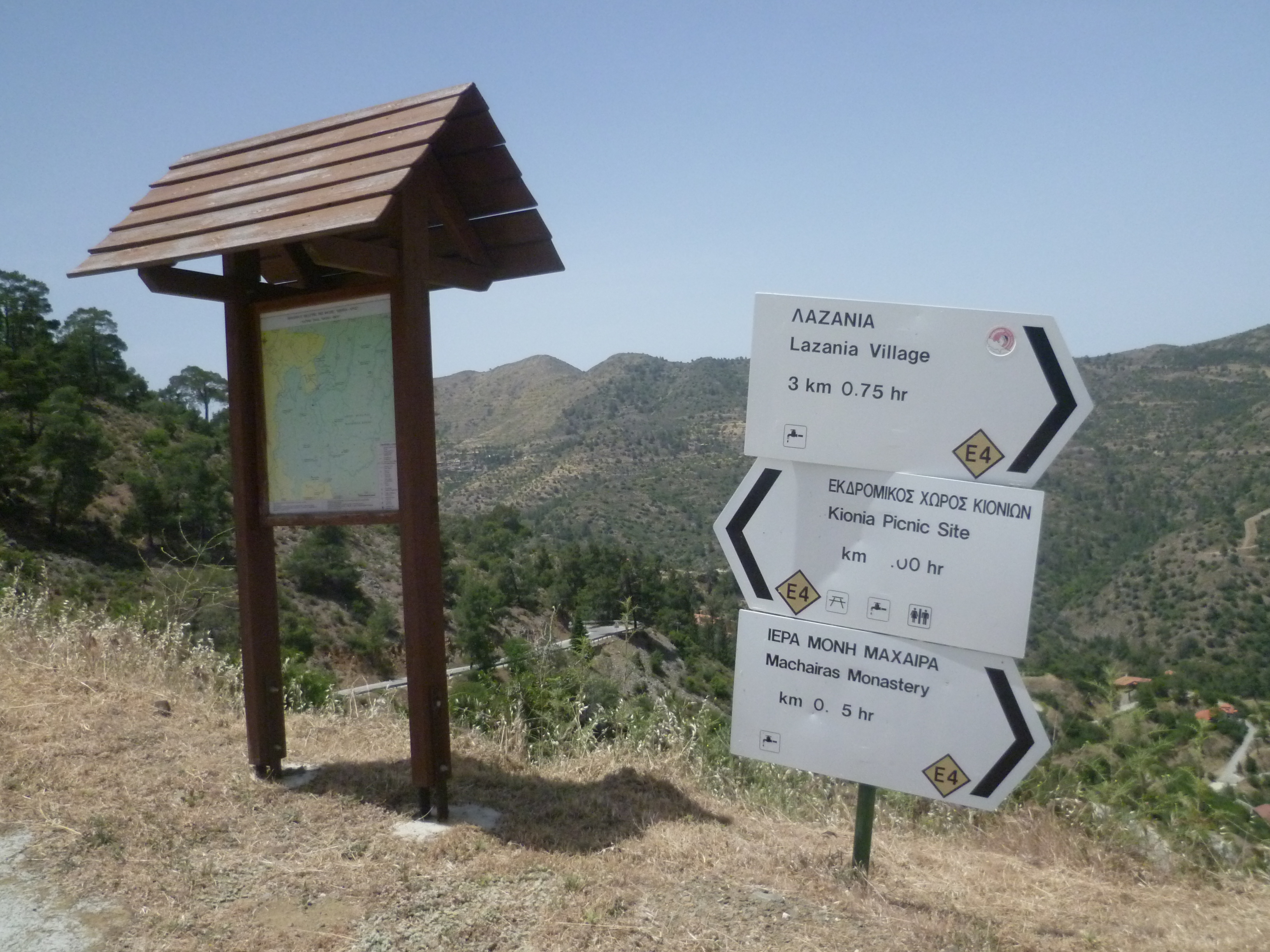 When you’re ready to leave take the asphalt road heading up behind the monastery. You are now on the E4, the European Long Distance Trail, heading towards Kionia. The road winds a short 0.5 kilometre to the top of the hill where there is a large cross and a trail signboard (3 hours 40 minutes)