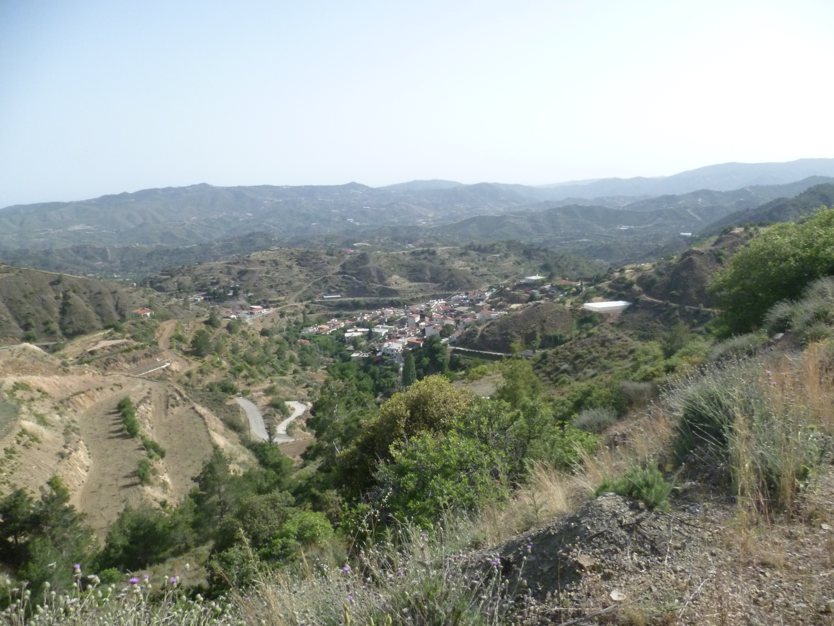 It can sometimes be a bit of a slog in the late afternoon sun but you will be well compensated by the views across this quiet valley…and of course it’s all downhill! The road winds gently down and it’s not until 6 hours 50 minutes that Agioi Vavatsinias comes into view below and to your right.