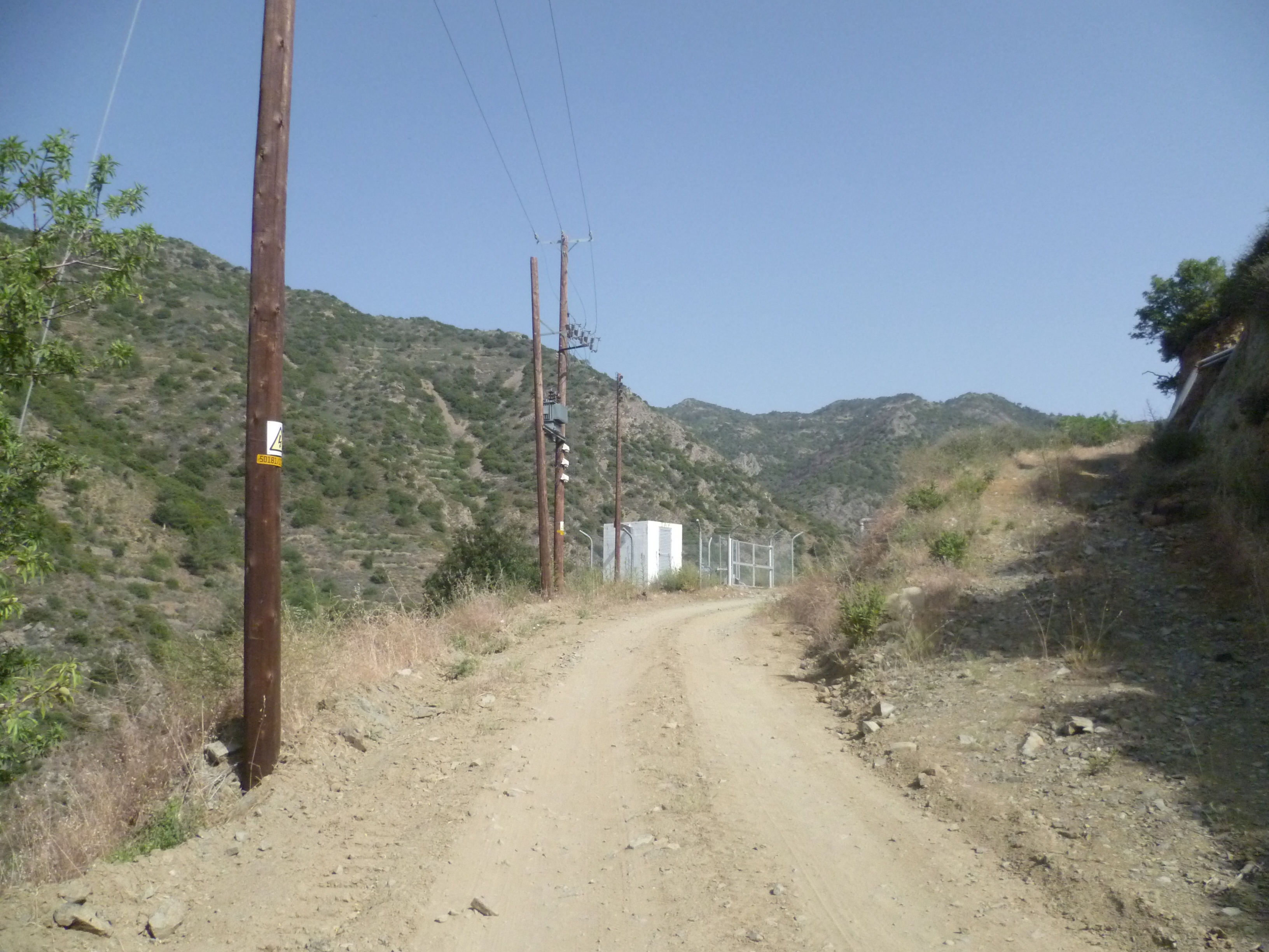 This will probably be the most difficult part of the walk. The trailboard is at an altitude of 952 metres and you are now heading to a point just below the large white ball of the Machairas look-out station which you can see in the distance at a height of 1,423 metres. Moreover, this is now likely to be the hottest part of the day!
