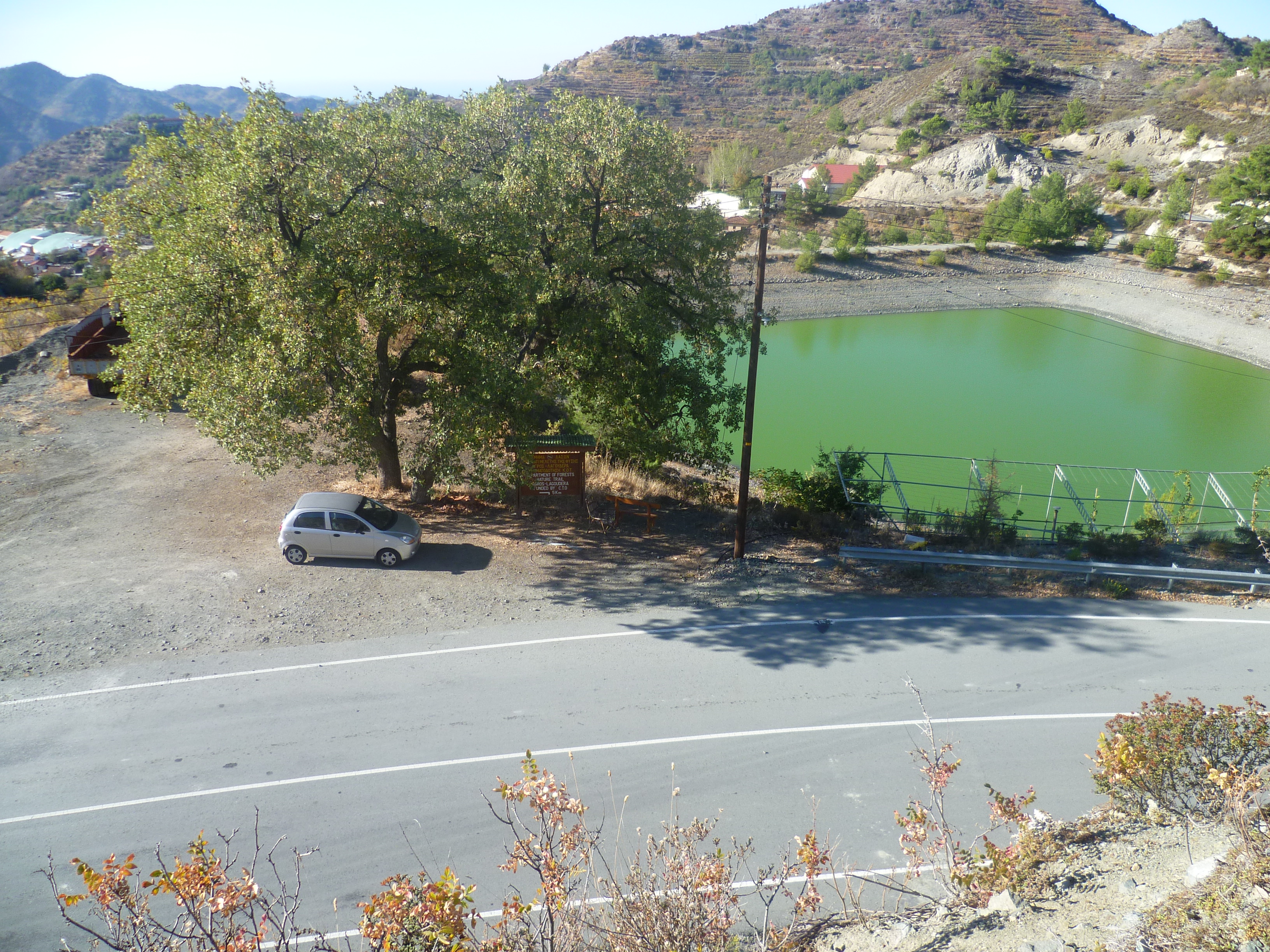 It begins at the start of the Agros-Lagoudera nature trail (1100m), which is marked on the CTO maps. Park next to the Agros reservoir which is just above the village on the F945, the Troodos/Lefkosia road. [GPS Co-ordinates: 34.924442N, 33.015544E]