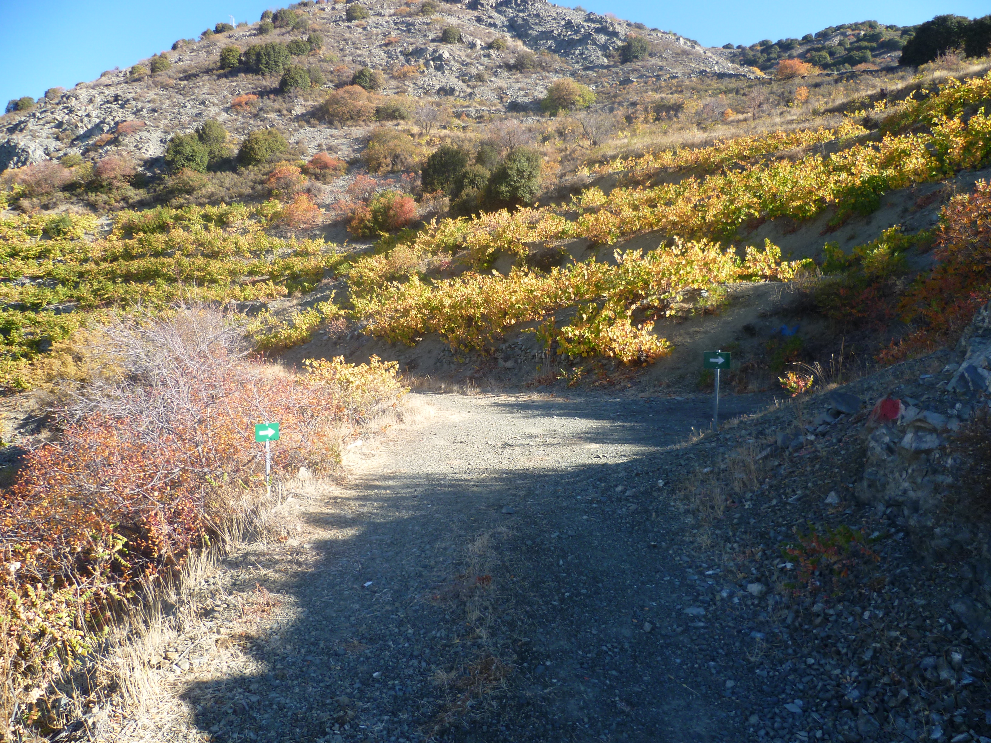 After 10 minutes the track takes a sharp right just before a vineyard (see photo below – there was a green sign to indicate when we last walked this in October 2022) then climbs sharply up a rock shoulder back towards the telegraph wires.