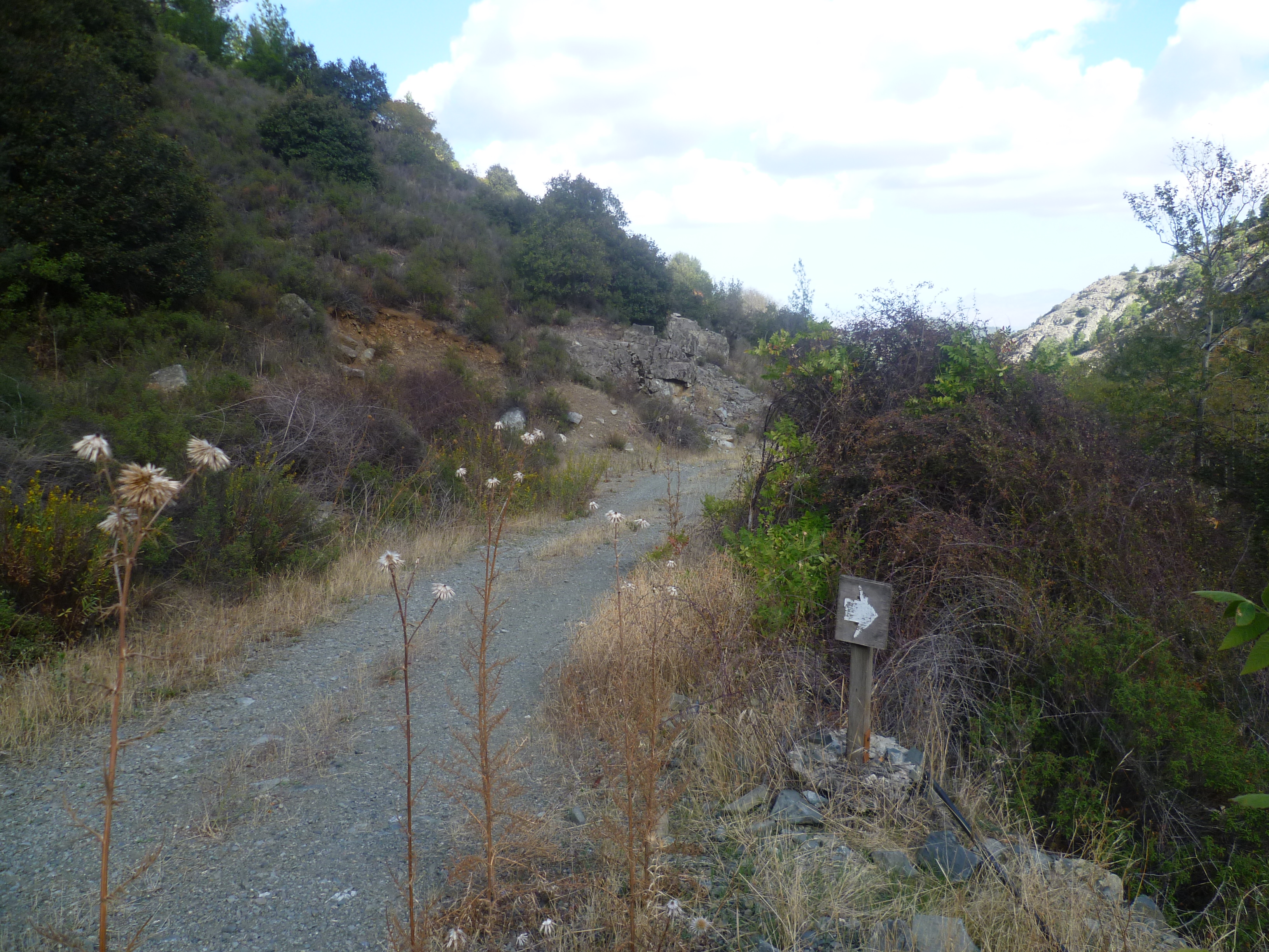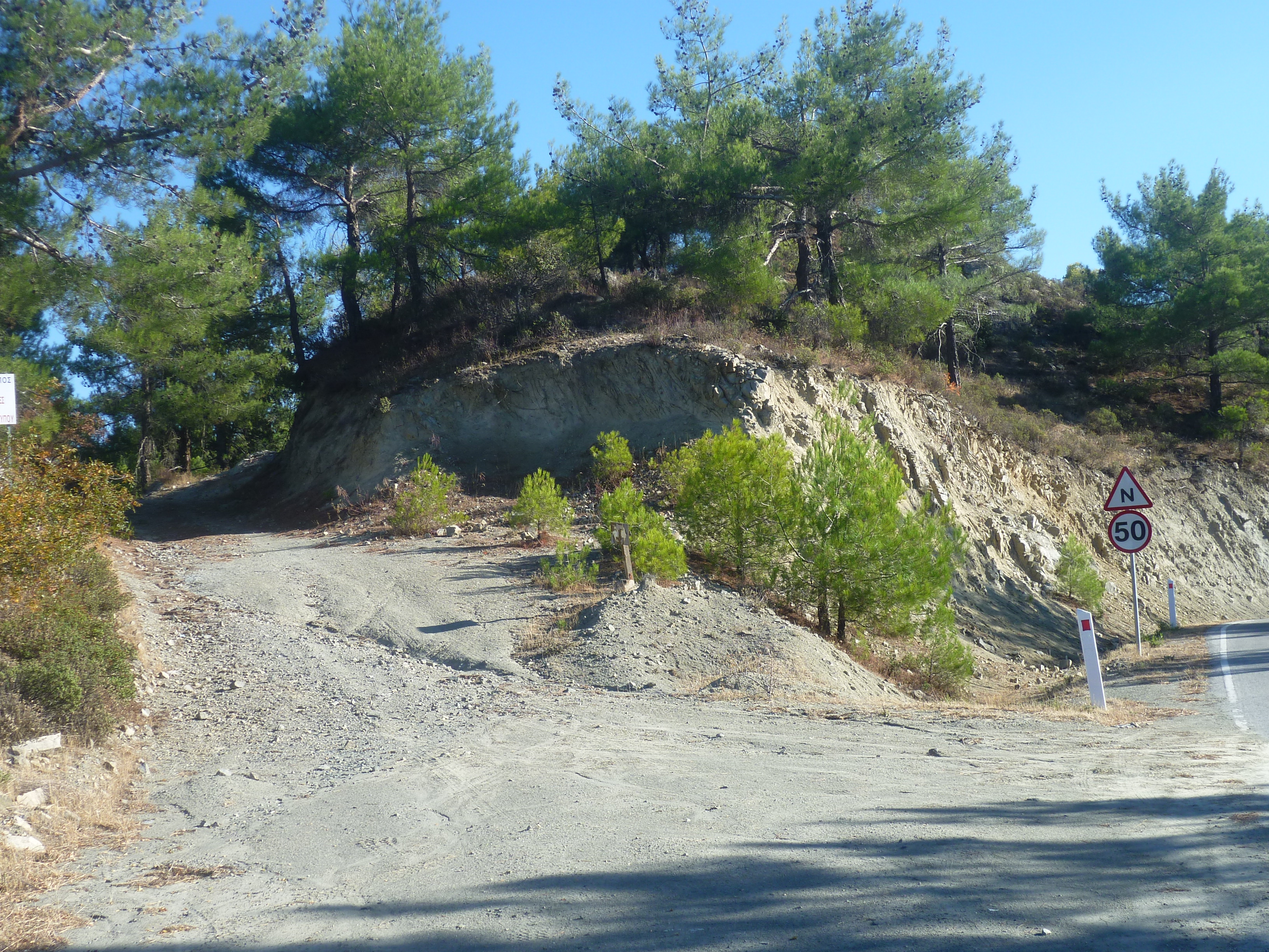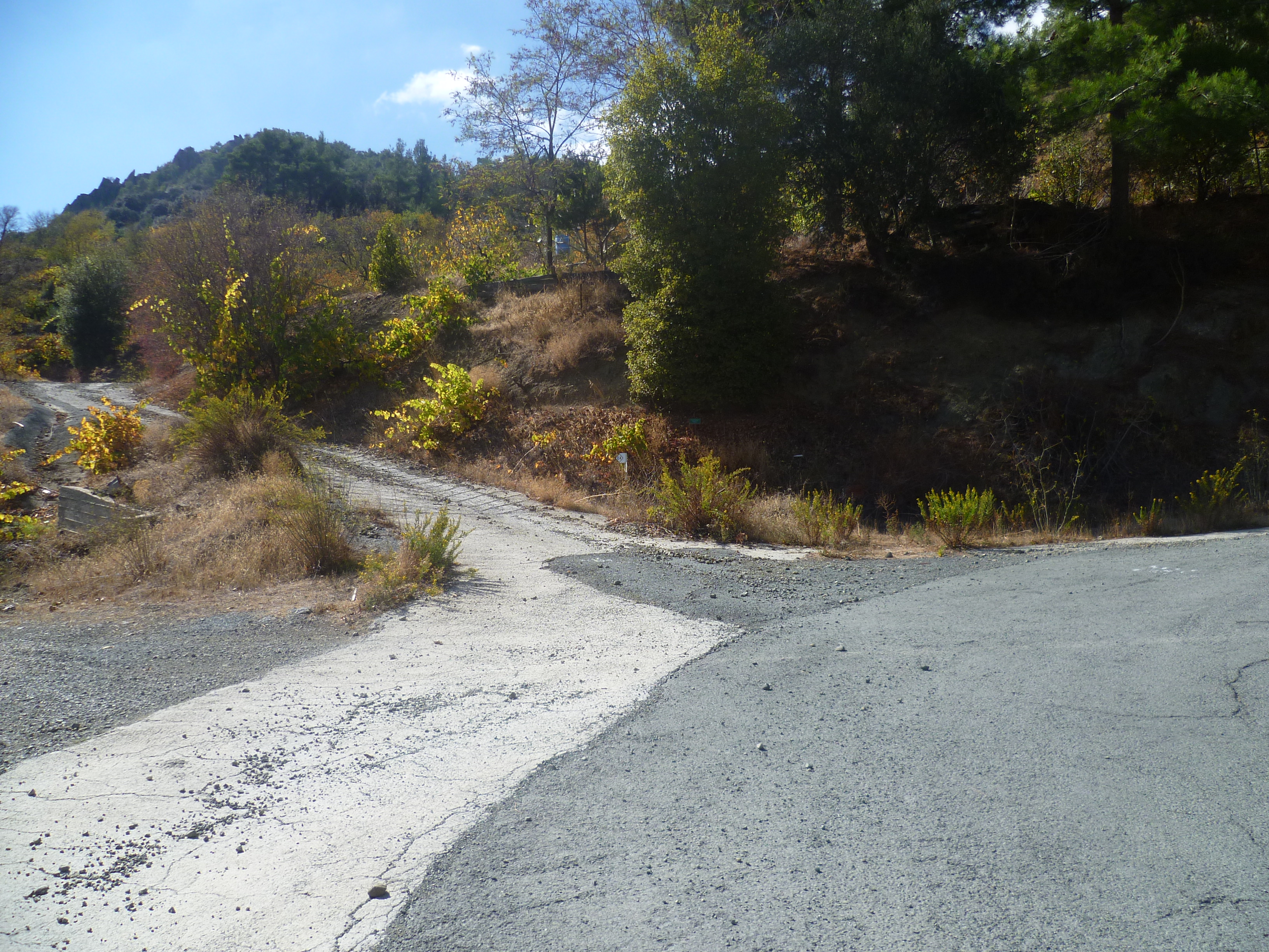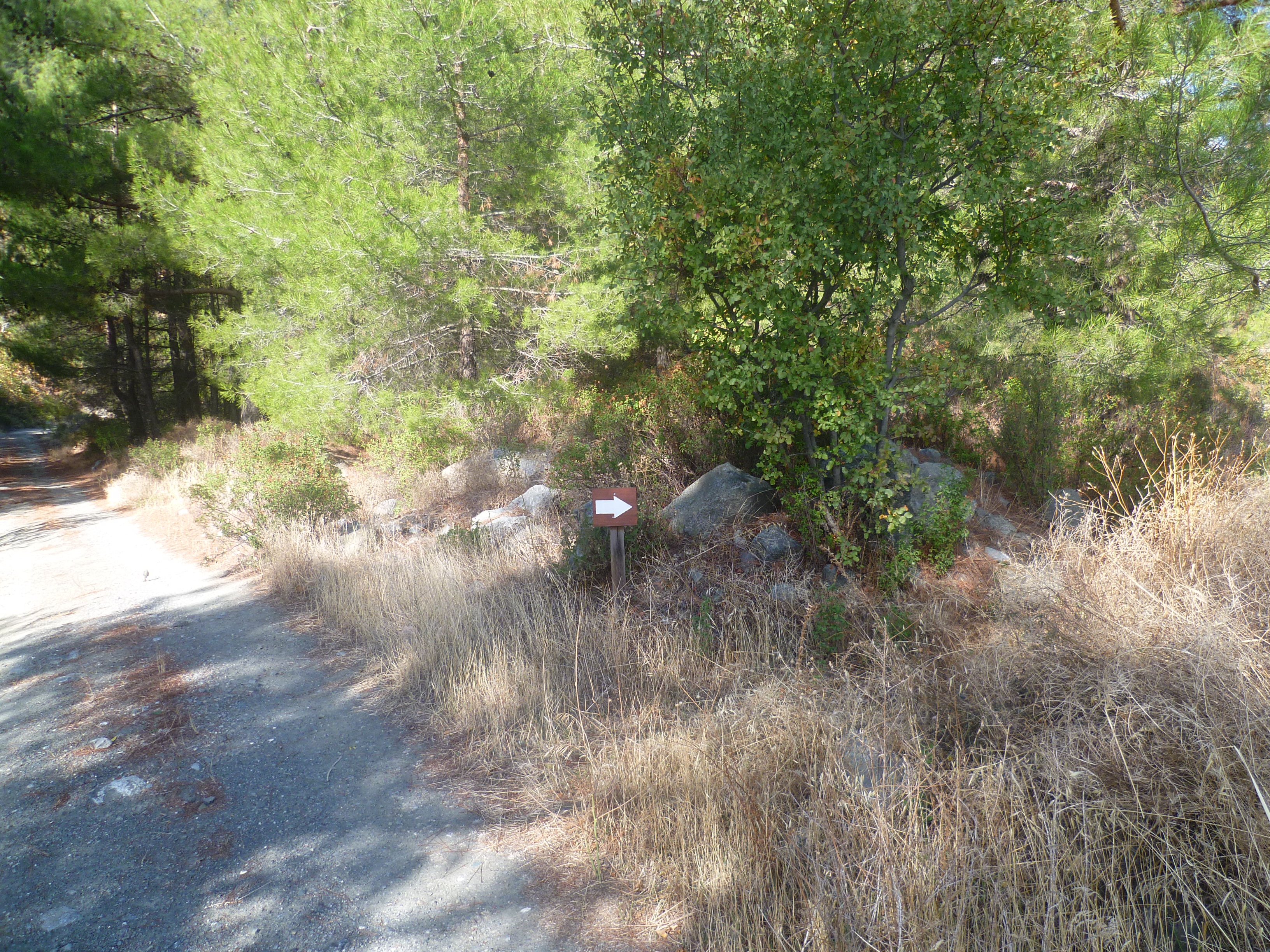 Walk down the Agros road for about 5 minutes. Just before a road sign for double bends and a 50mph limit, take the earth track to your left, as indicated in the picture below. [GPS: 34.938010N, 33.007634E]