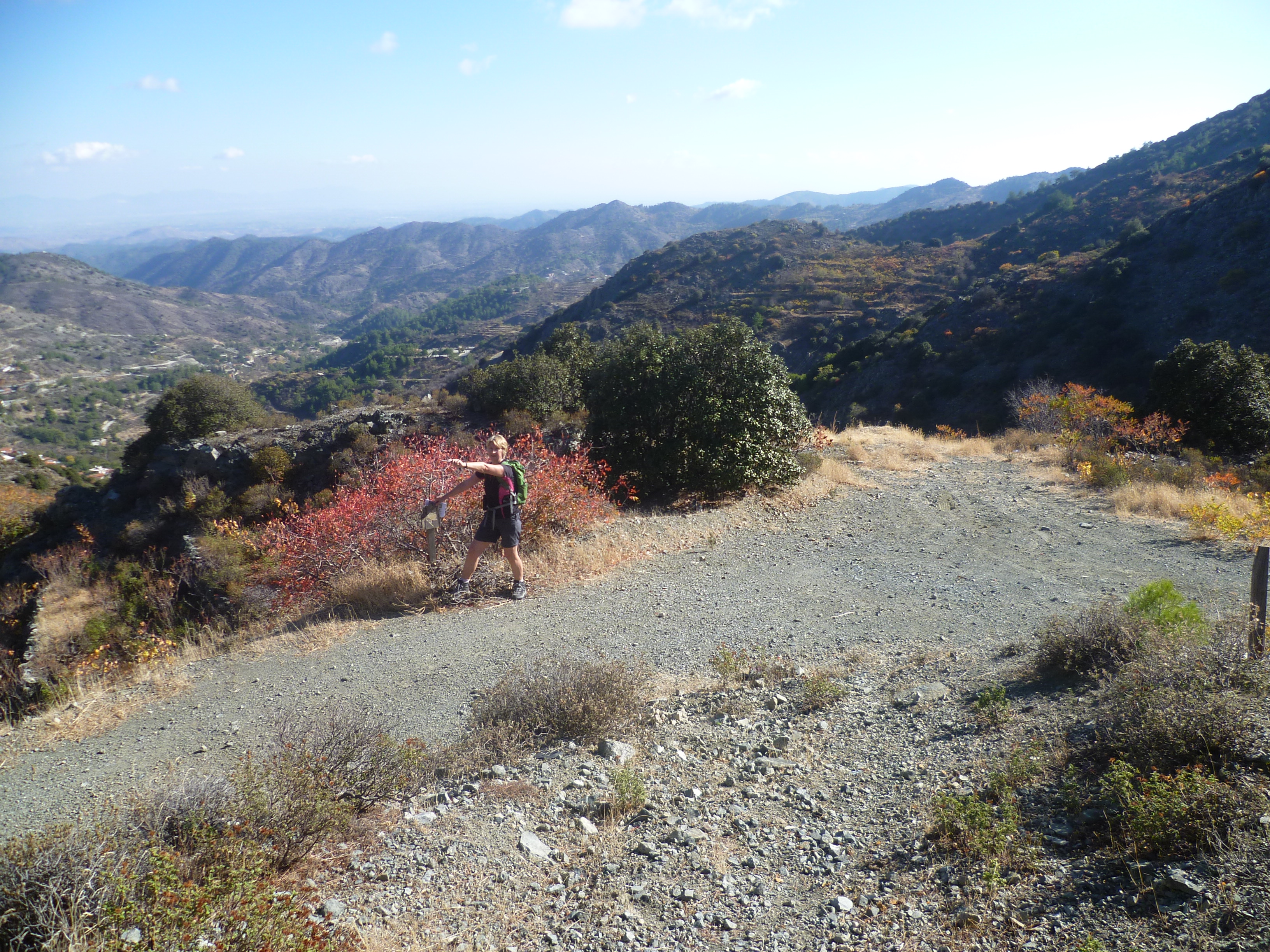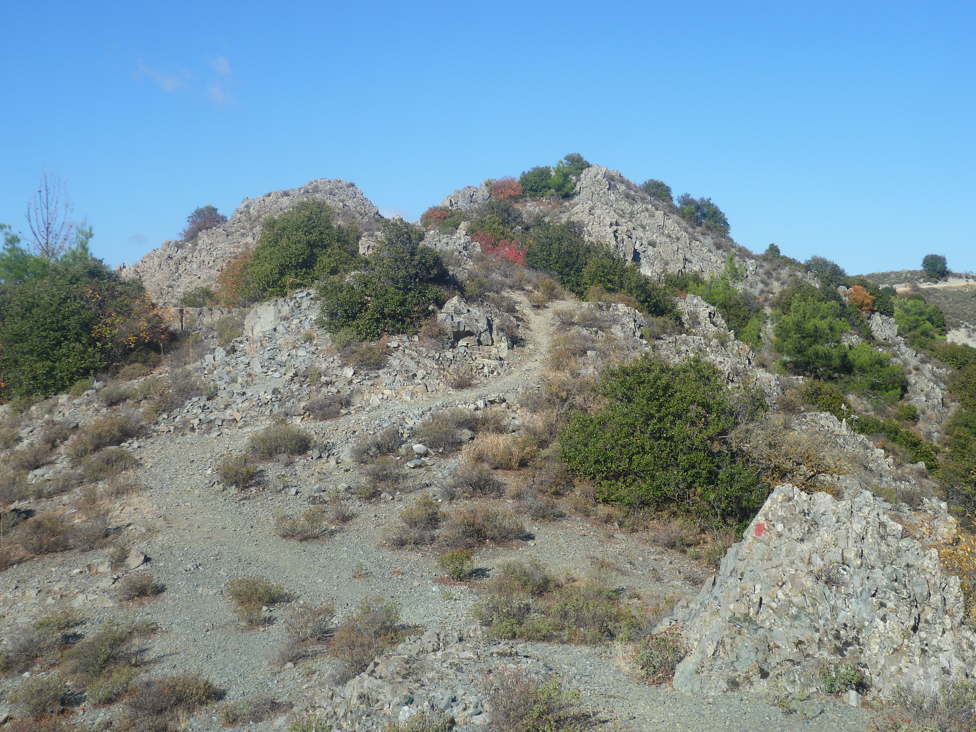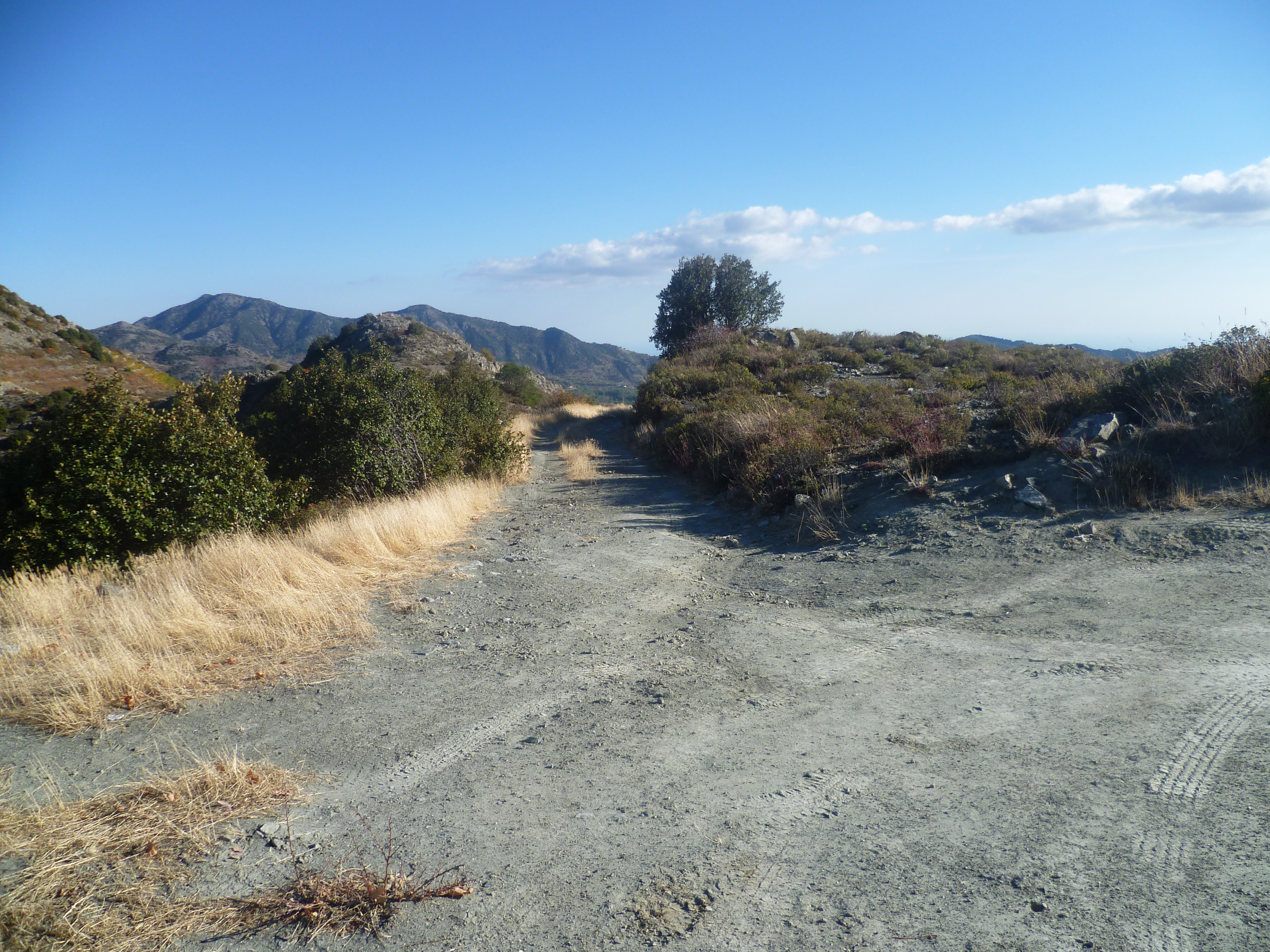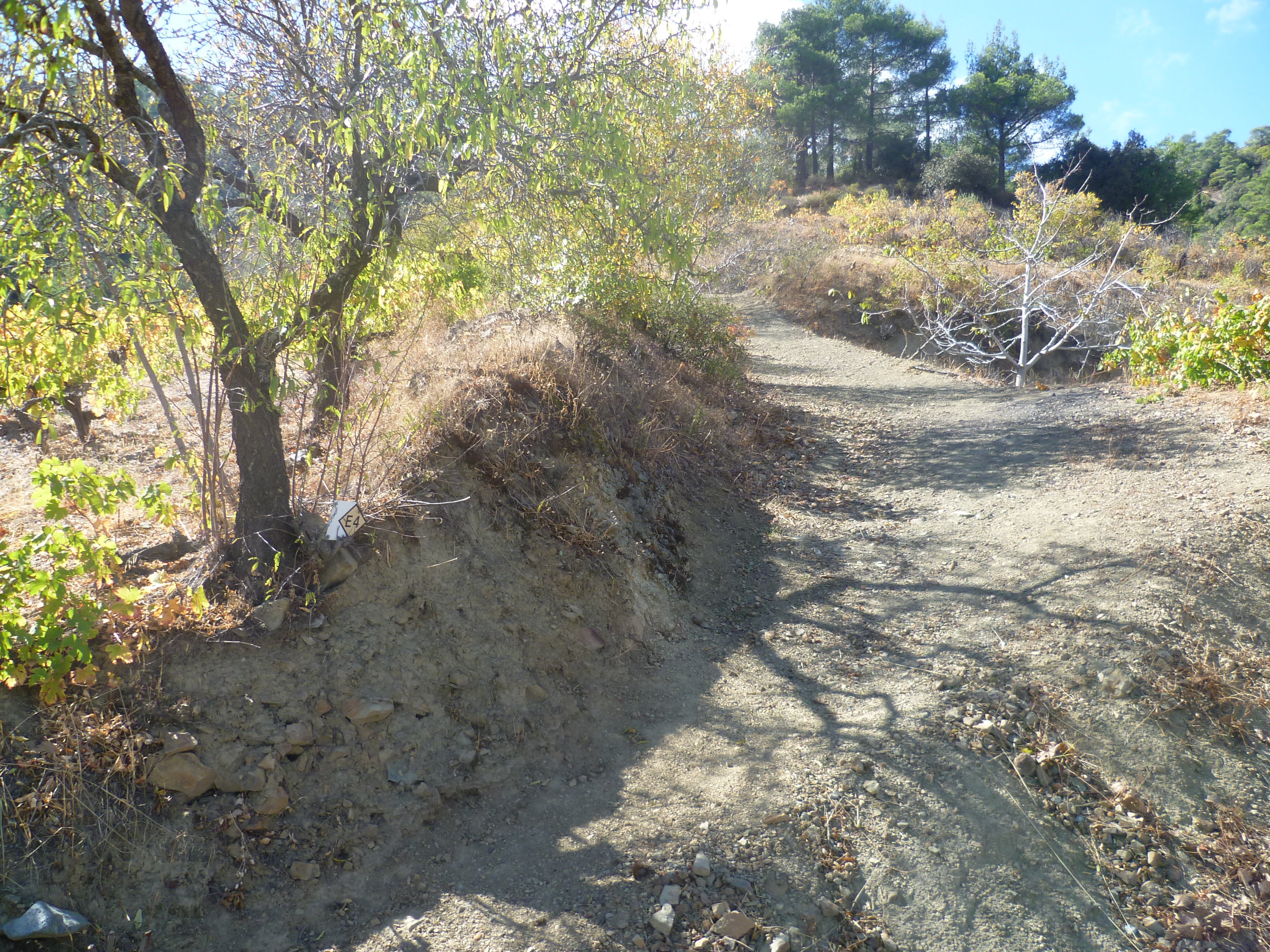 Walk down the Agros road for about 5 minutes. Just before a road sign for double bends and a 50mph limit, take the earth track to your left, as indicated in the picture below. [GPS: 34.938010N, 33.007634E]