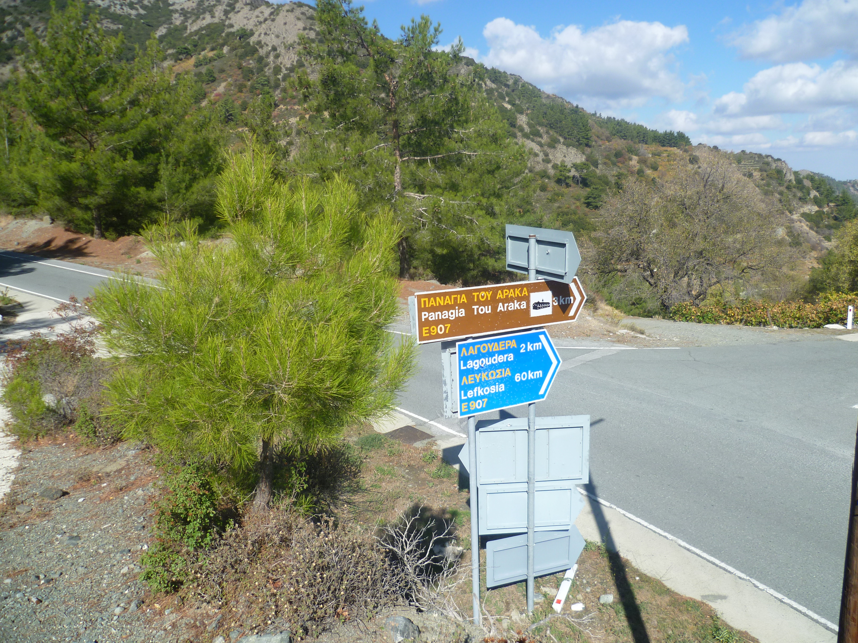 There are occasional dilapidated wooden boards with arrows to mark your way and, in recent times, a number of renewed metal green signs at fairly regular intervals. Continue along the main track, ignoring any tracks heading off to the right or left, until you reach an asphalt road and the junction of the E931 and E907 with signposts to ‘Lagoudera 2km’ (1 hour 20 minutes).[GPS: 34.947912N, 33.010792E]