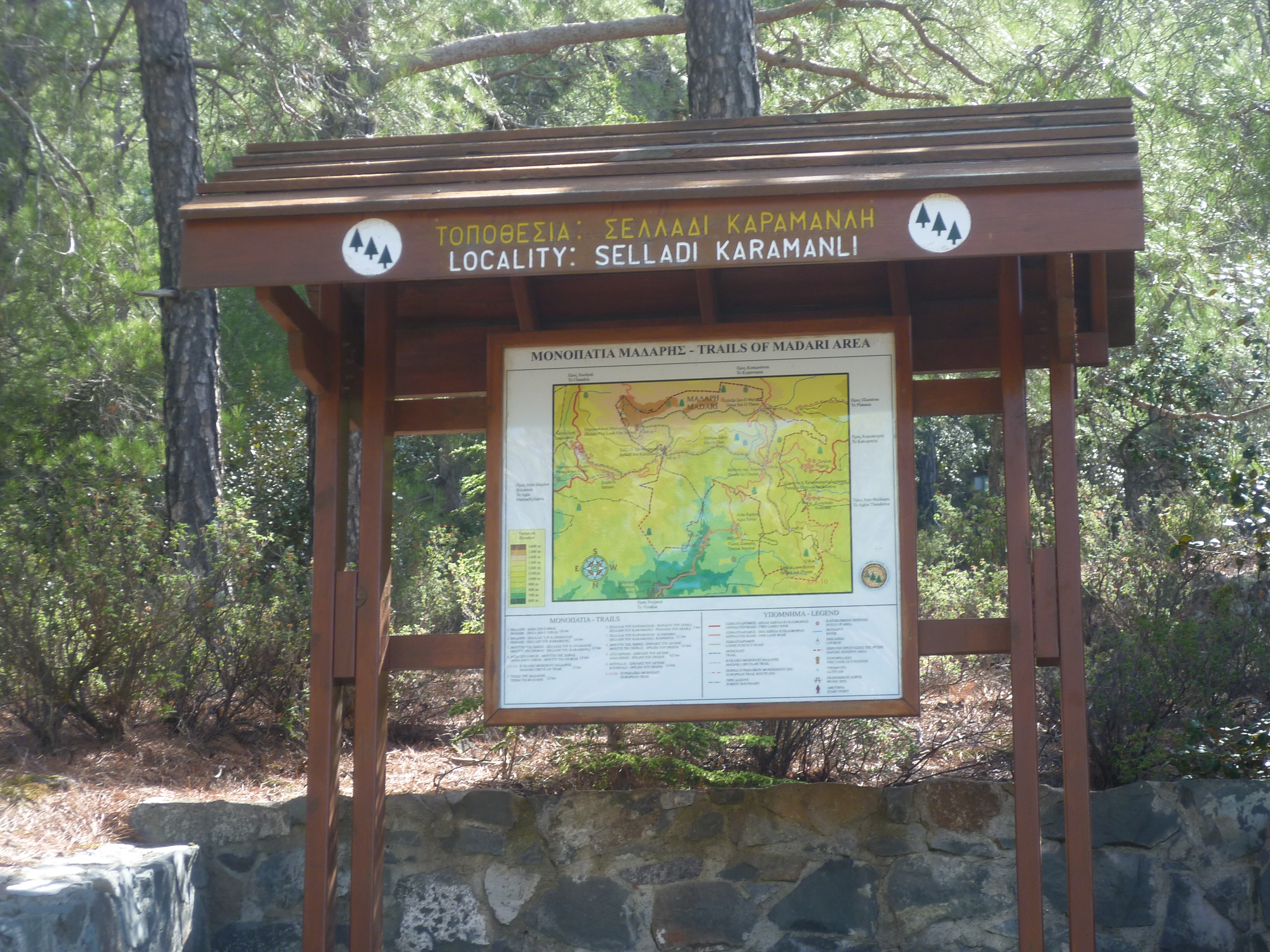 …and the nature trail board of Saladi Karamanli (3 hours 5 minutes) You are now at an altitude of 1,230 metres. [GPS: 34.964847N, 32.988145E]