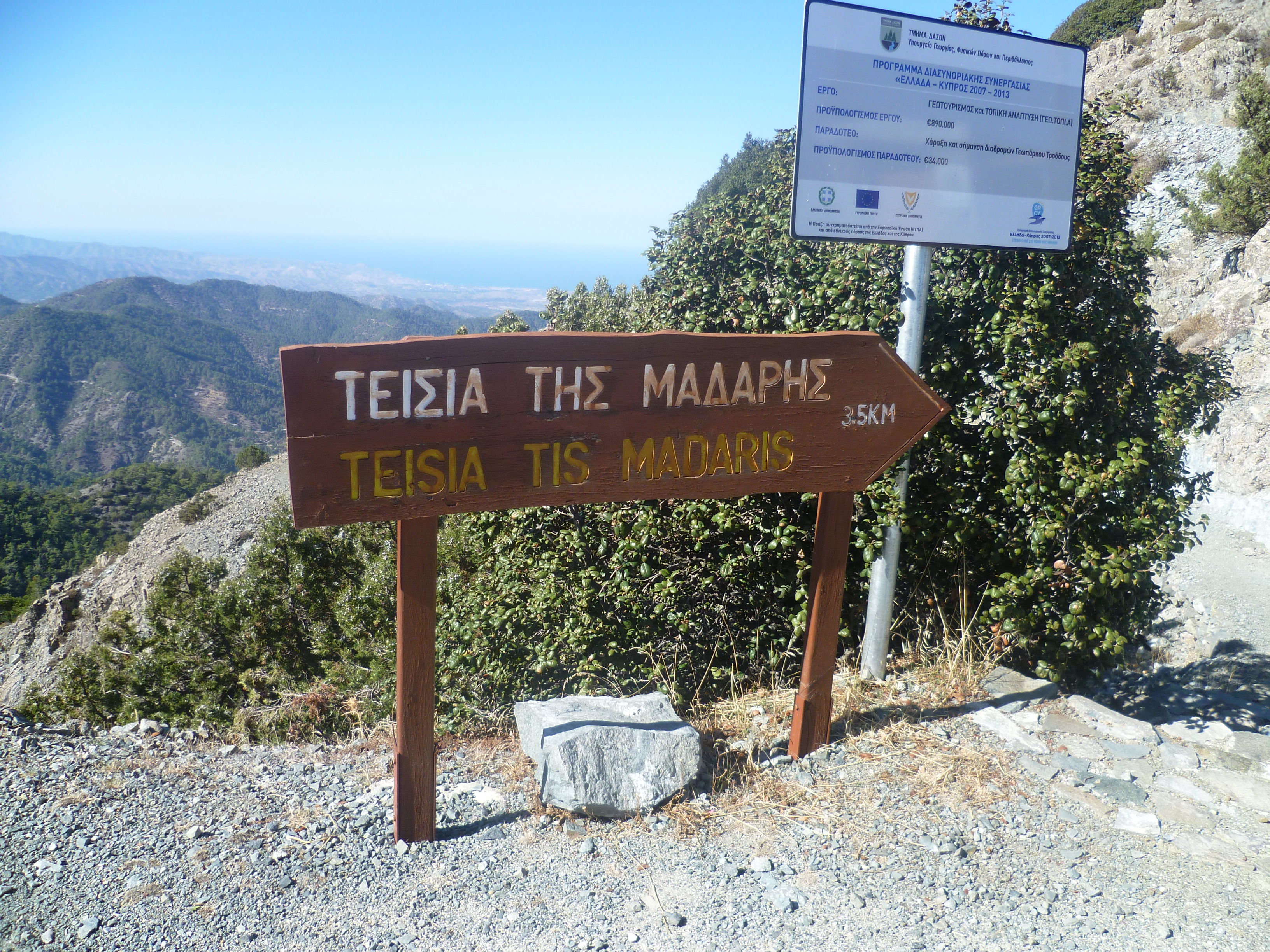 Take the path, behind the nearby bench, to ‘Madhari 3.6km & Doxa Soi O Theos 7.4km’, pausing first to look at the EOKA memorial to Charalambos Petmeridos.