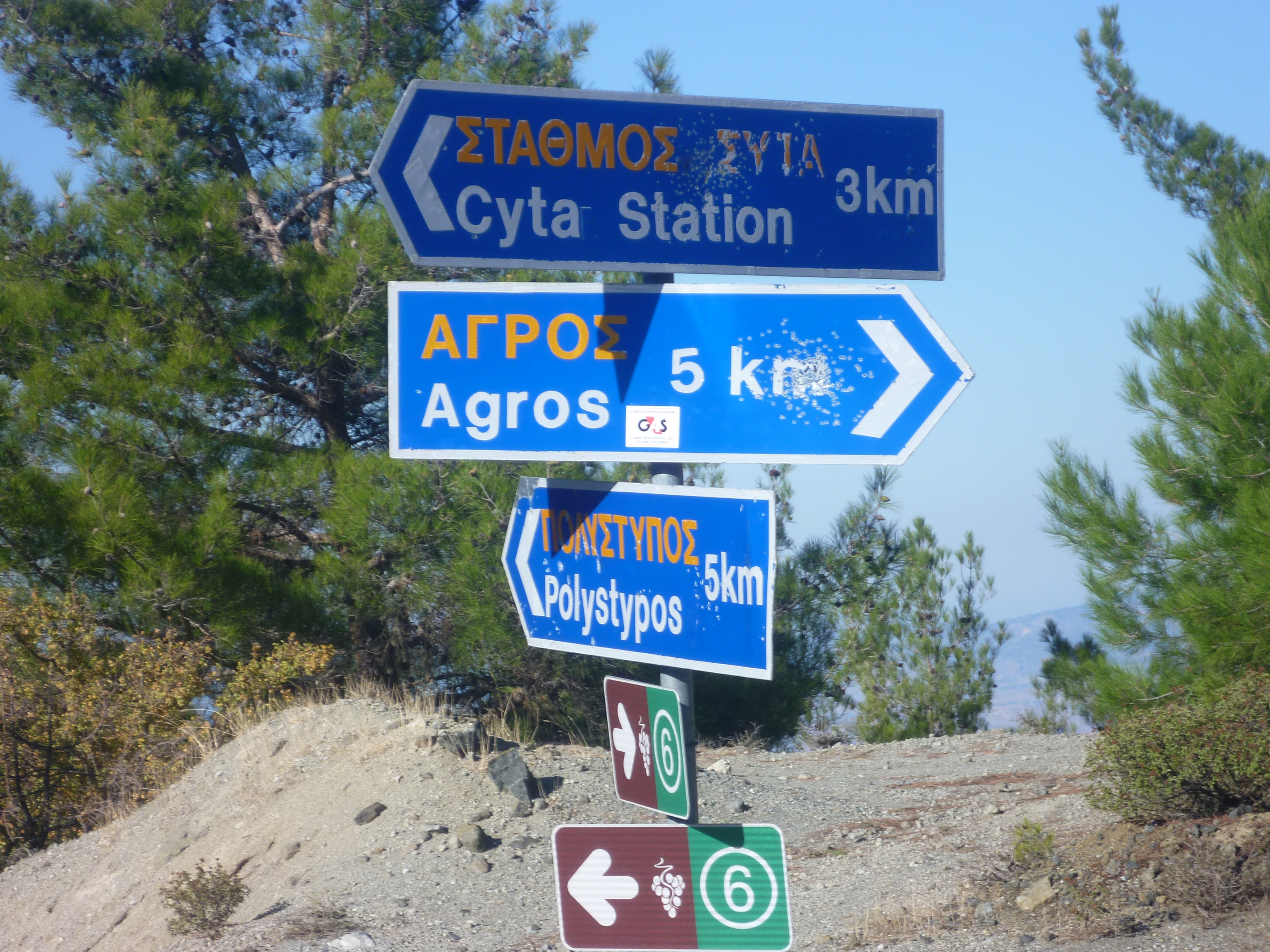 When you reach the end of the Teisia tis Madaris trail (4 hours 45 minutes) you’ll see a CYTA station to your right. [GPS: 34.951375N, 32.999102E] Follow the deserted asphalt road to your left down the hill until you reach a junction with wooden boards pointing back up to the nature trails behind you, and to Agros 5km ahead of you. (5 hours 15 minutes) [GPS: 34.940173N, 33.005308E]