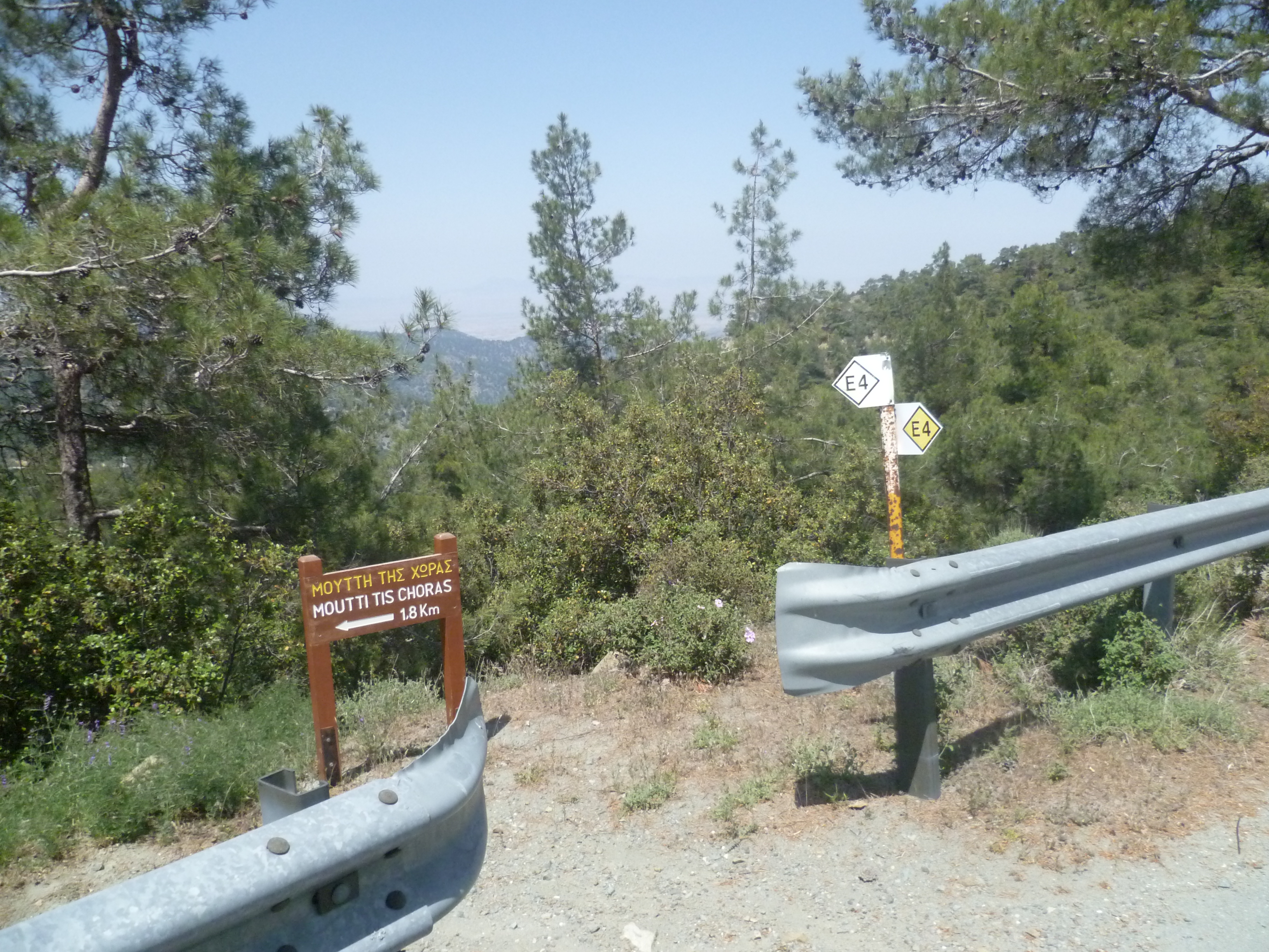 When you are ready to continue, turn right onto the asphalt road and after a few metres you will see an E4 sign and a wooden board pointing to ‘Moutti tis Choras 1.8 km’.