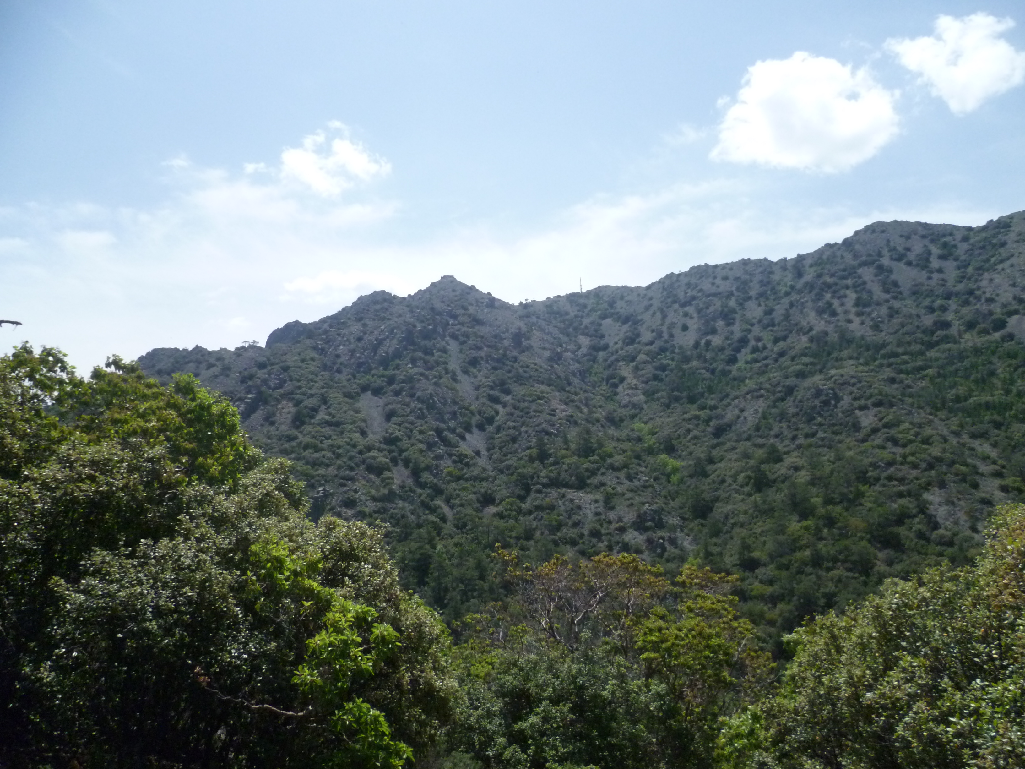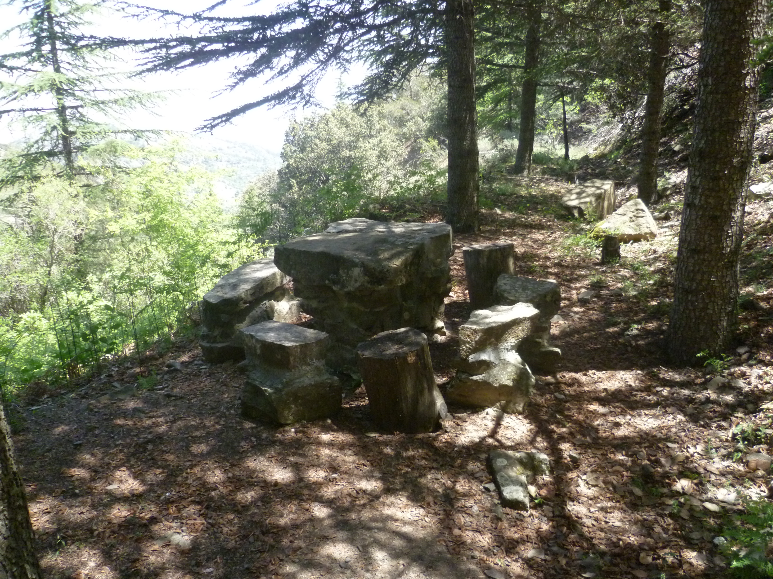 After 2 hours you will pass a rustic stone table and chairs with a marvellous view across the valley. When we walked this route in early May wild peonies looked lovely scattered across the hillside. Take advantage of this shady spot before continuing along the trail and starting to climb up toward the ridge.