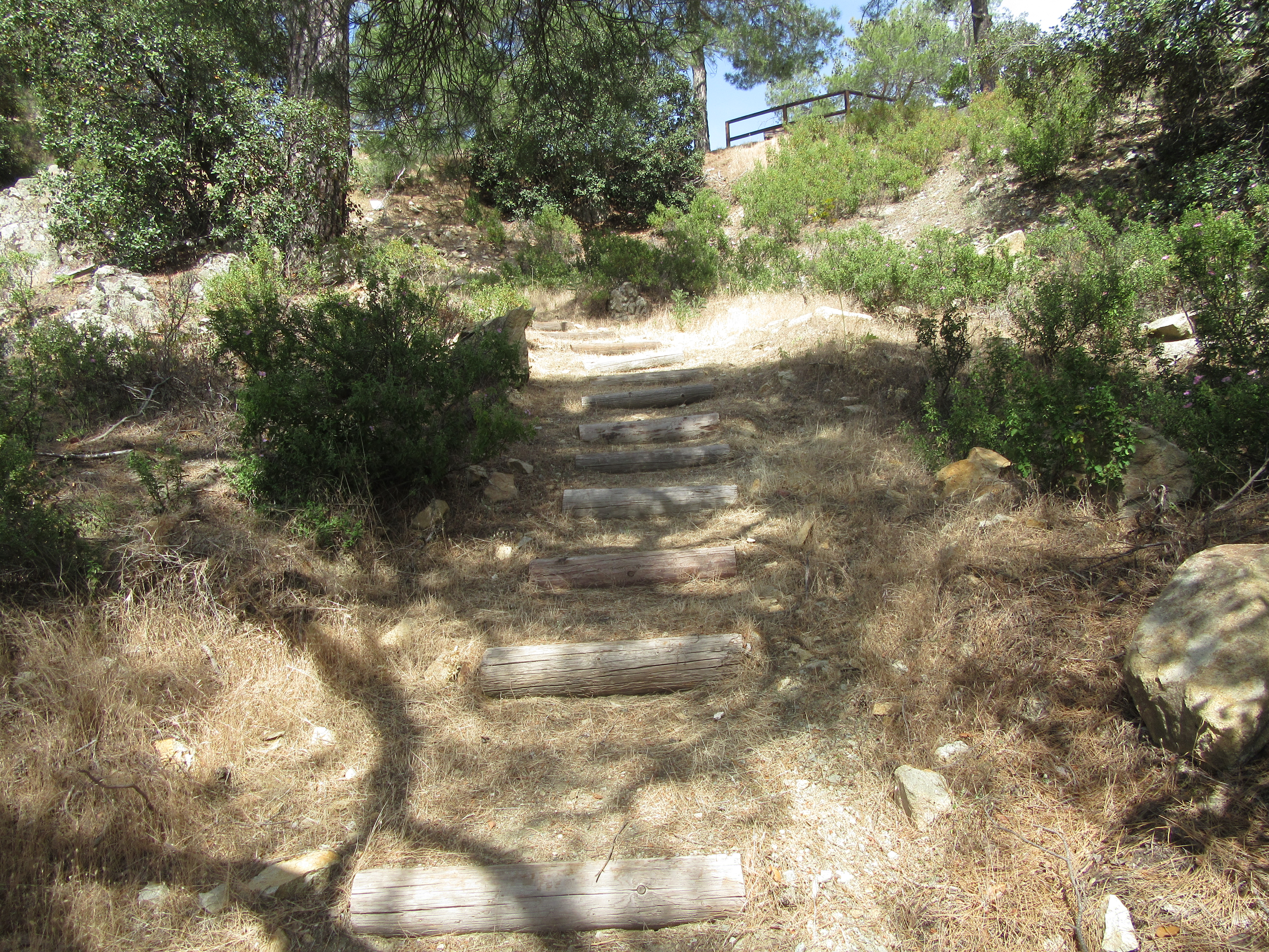 Follow the trail sign to Moutti tis Choras 600m and after 9 minutes leave the road to continue on the trail up a grassy path next to a telegraph pole. Climb the path and the wide wooden steps.